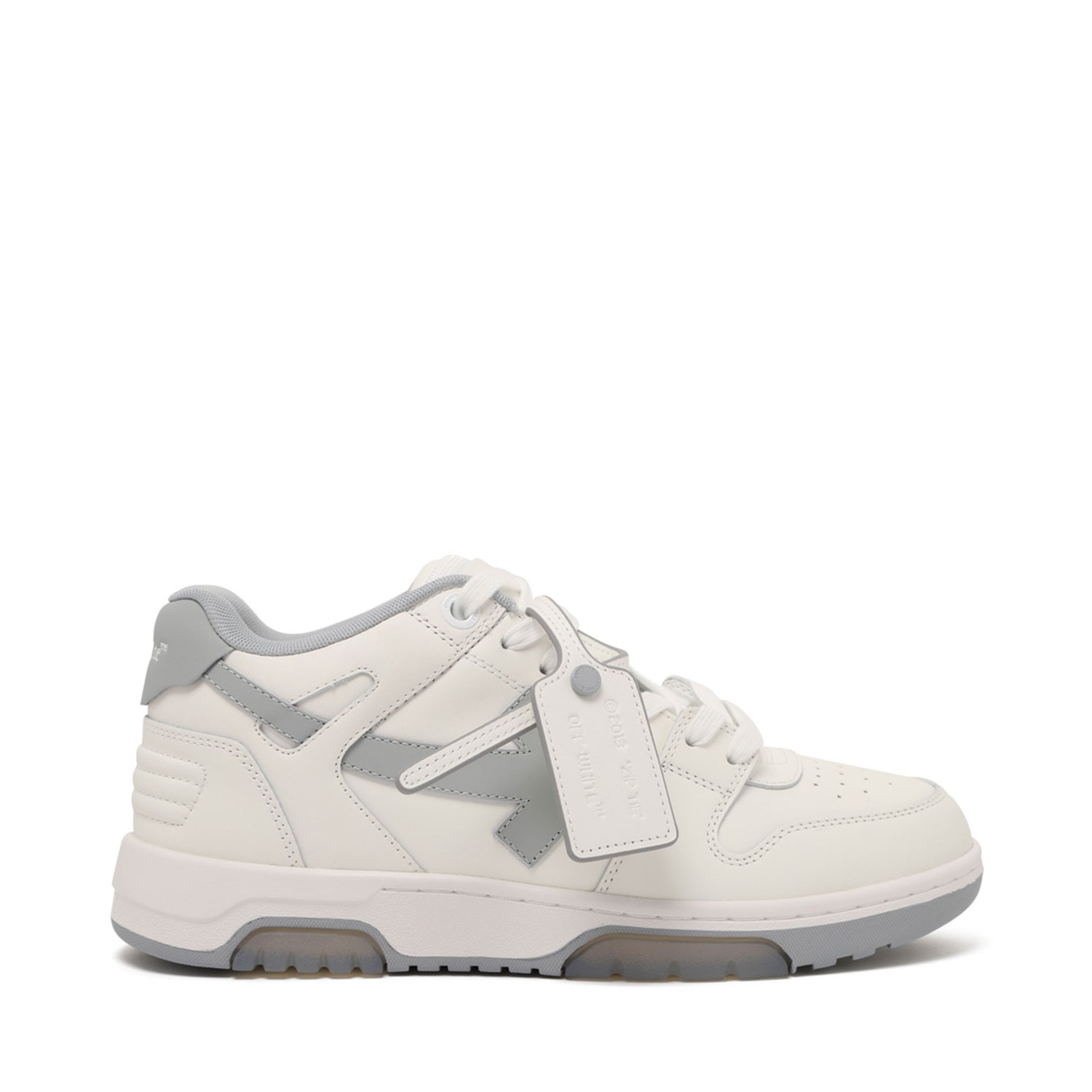 Off White White and Grey Out Of Office Sneakers. White and grey low top sneakers with signature arrow motif detail, iconic zip tie, quoted "Shoe Laces". Branded tongue and heel counter, lightweight cushioned midsole, treaded rubber sole.