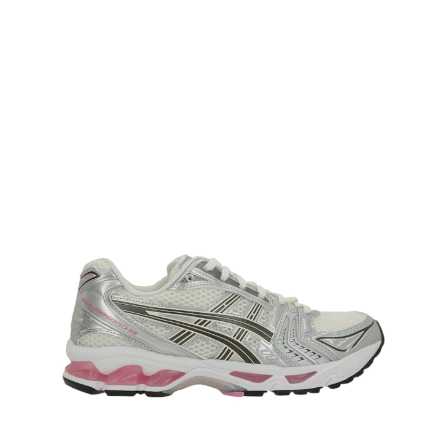Asics Cream and Pink Gel-Kayano 14 Sneakers. Cream and pink low-top sneaker crafted from ivory mesh and silver faux leather. Featuring a lace-up closure, round toe, textile lining, GEL inserts in the heel and forefoot, and a textured rubber outsole with Ortholite Foam technology. The iconic logo patch on the tongue completes the design.