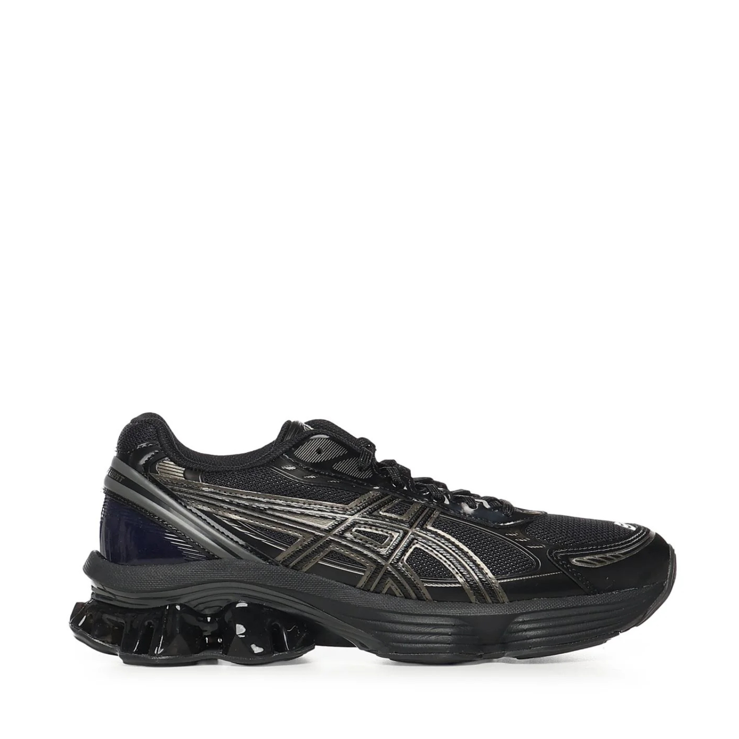 Asics Black and Graphite Grey GEL-KINETIC FLUENT Sneakers. Black and graphite grey sneakers draws inspiration from running shoes of the past and reinvents their traditional influences by applying modern technologies. The upper construction of this line draws on elements of technical welding and eyelets from running shoes of the 2010s. These details are combined with contemporary materials that add depth and texture to the design.