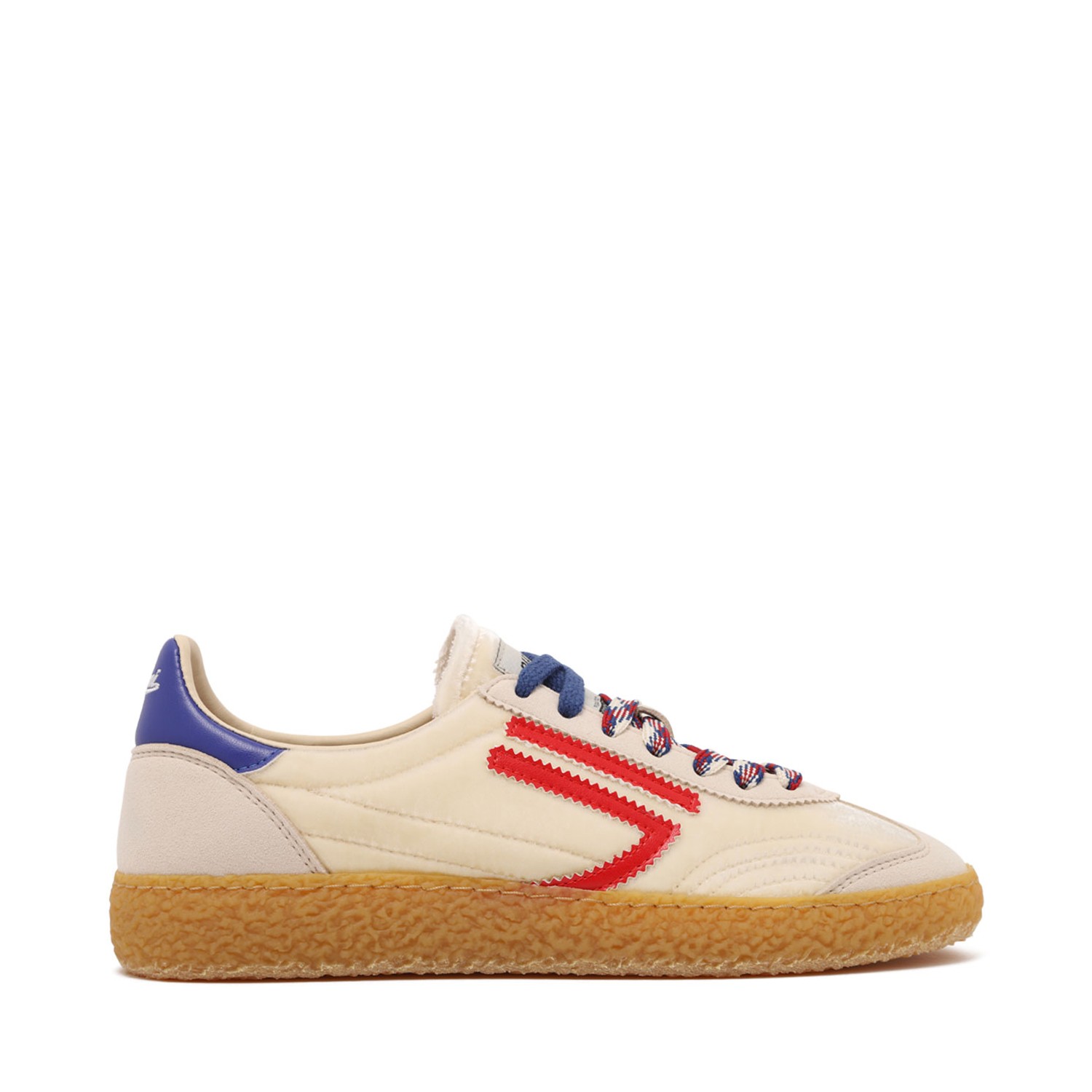 Puraai Summer Sand Low-Top Sneaker In Recycled Materials. Summer sand low-top sneaker with a retro-inspired, sustainable design. Sneaker crafted from recycled textile and vegan suede with contrasting side stripes. Featuring lace-up closure, padded collar, textured rubber sole with a bold profile, branded side detail and cushioned insole for everyday comfort.