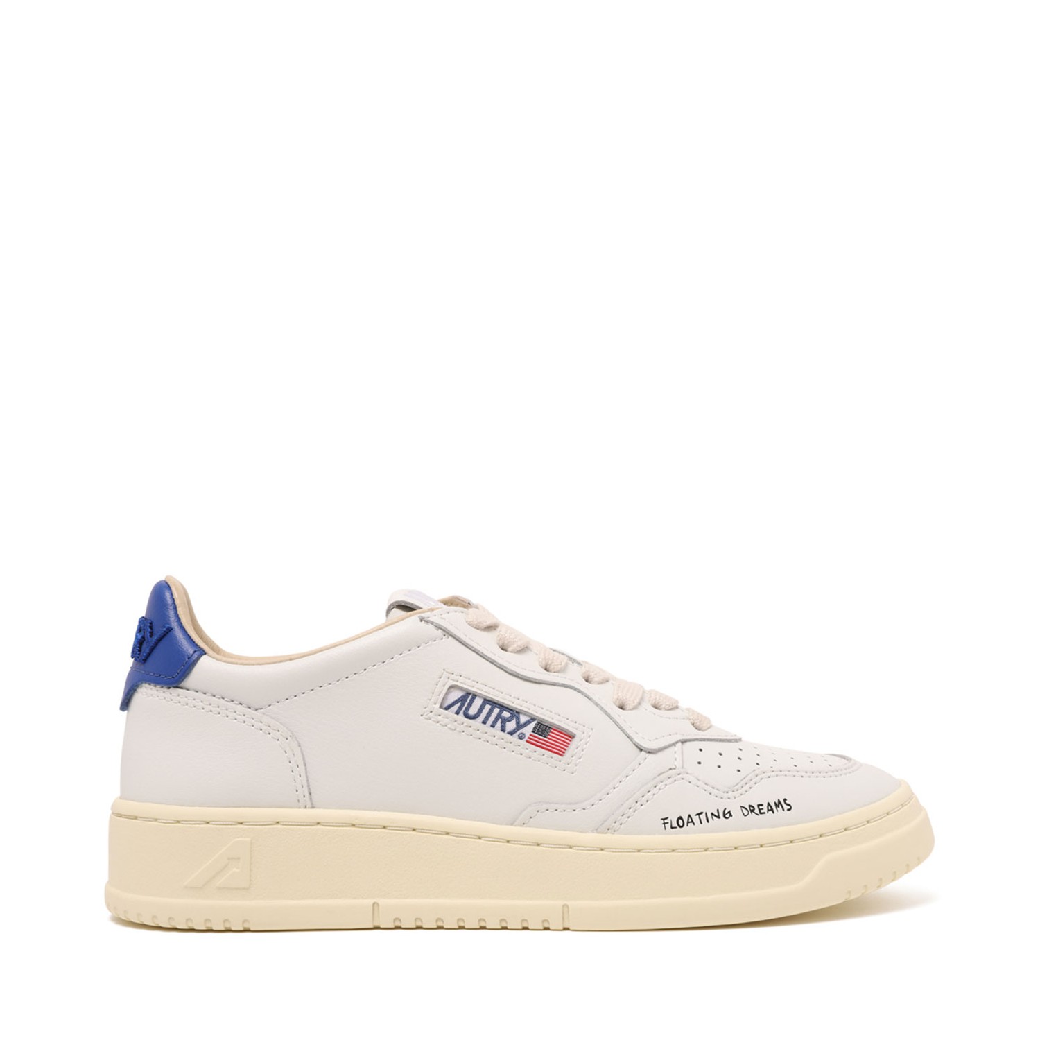 Autry White and Blue Leather Medalist Low Sneaker.White and blue low-top sneaker with a clean, vintage-inspired silhouette. Sneaker crafted in smooth leather with perforated toe detailing for breathability. Featuring lace-up closure, padded ankle collar, contrasting blue heel tab, rubber sole with a lightly aged effect, signature Autry logo with American flag on the side and
