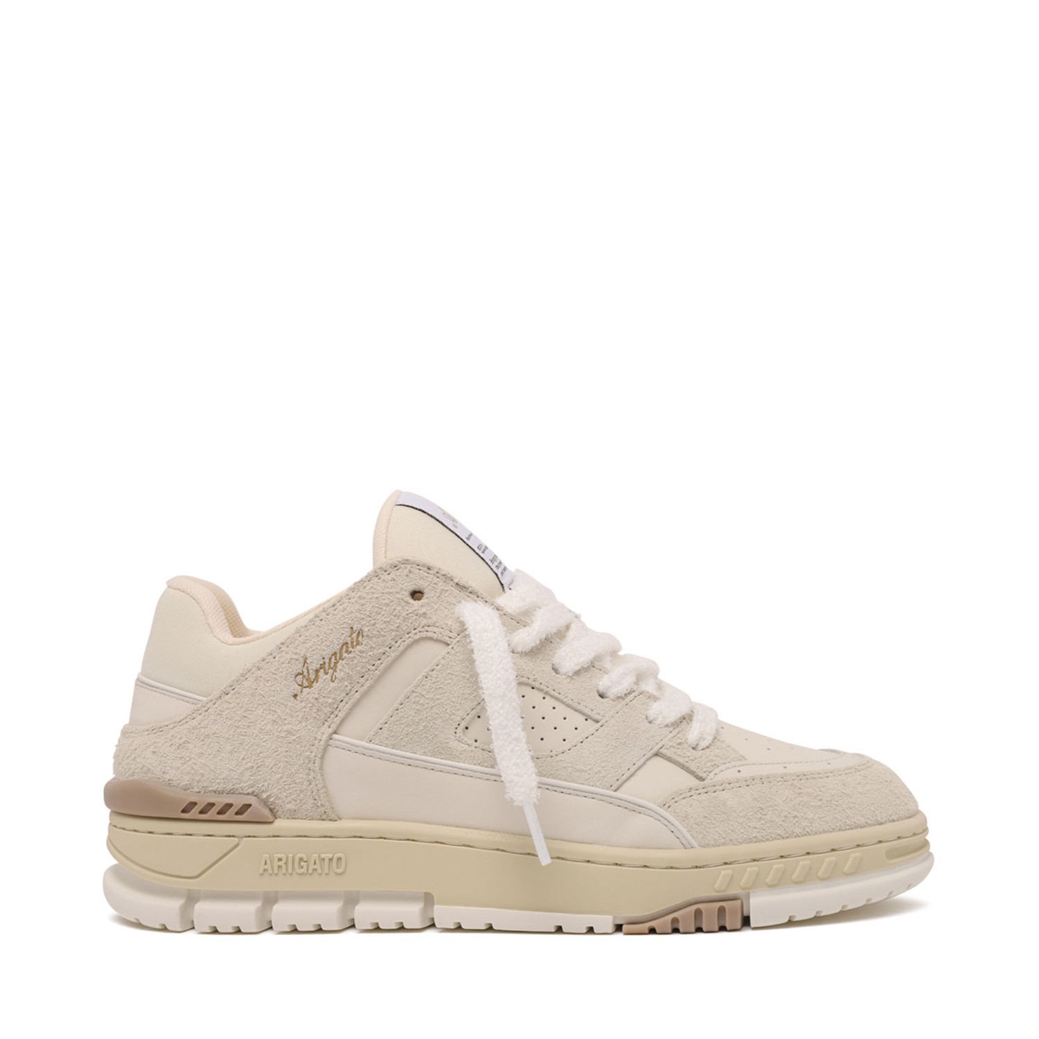 Axel Arigato Beige Area Lo Fluffy Sneaker. Beige premium leather and recycled polyester sneakers with logo stamp in metallic gold, branded woven tongue label.