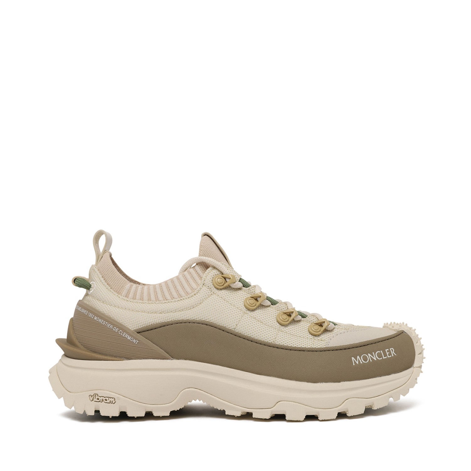 Moncler Trailgrip Lite3 Ivory and Beige Technical Sneakers. Ivory and beige low-top sneakers with a performance-driven, contemporary silhouette. Trailgrip Lite3 sneakers crafted in lightweight stretch knit and technical fabric with seamless panel construction for enhanced breathability and flexibility. Featuring lace-up closure with reinforced eyelets, Moncler logo detailing on the side, padded collar and pull tab for easy wear. Completed with a chunky high-performance rubber sole with deep tread for superior grip, stability and all-day comfort on urban and outdoor terrains.