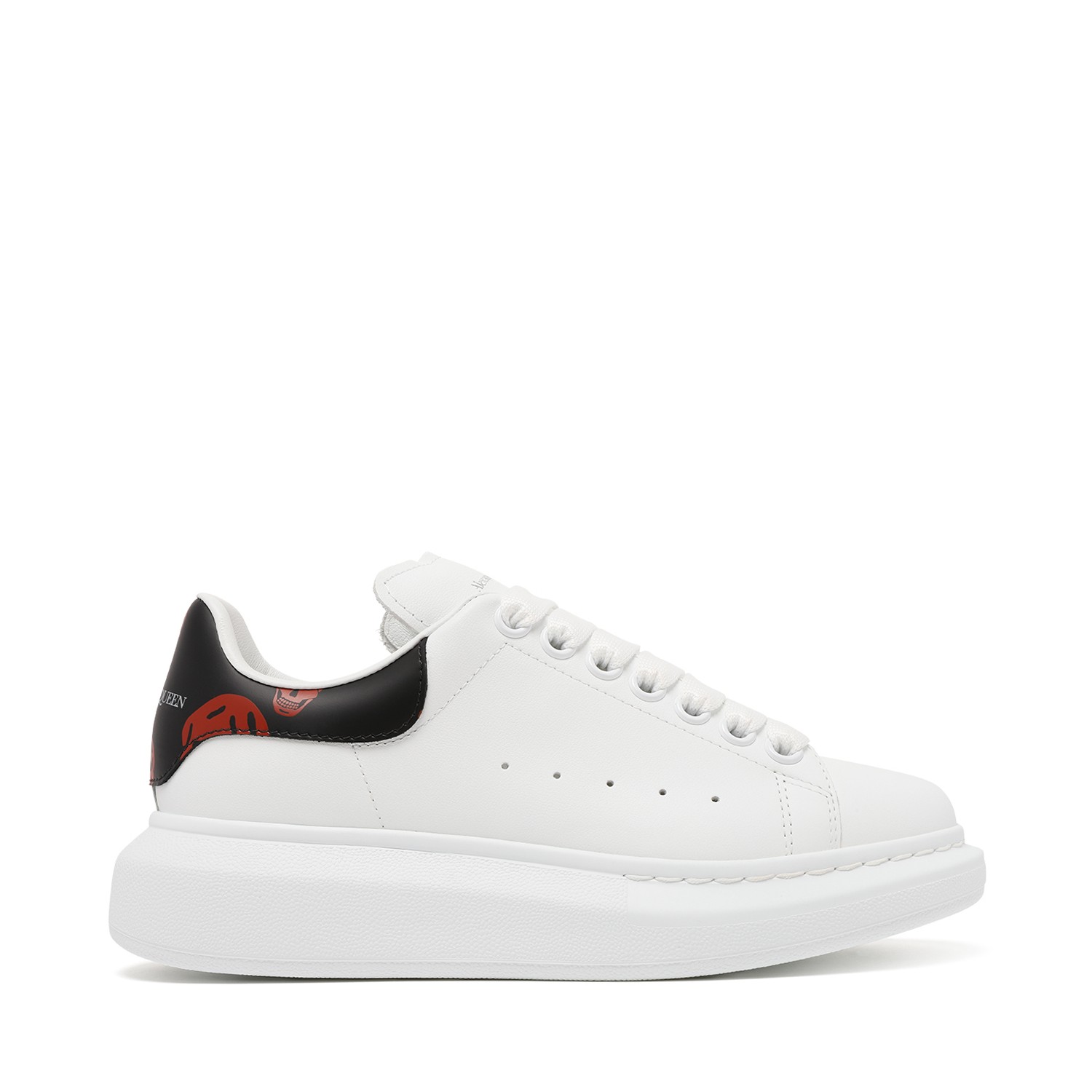 Alexander McQueen White Leather Oversized Sneakers. White leather sneakers defined by a clean, contemporary silhouette. Crafted from smooth premium leather, these Alexander McQueen sneakers feature the brand