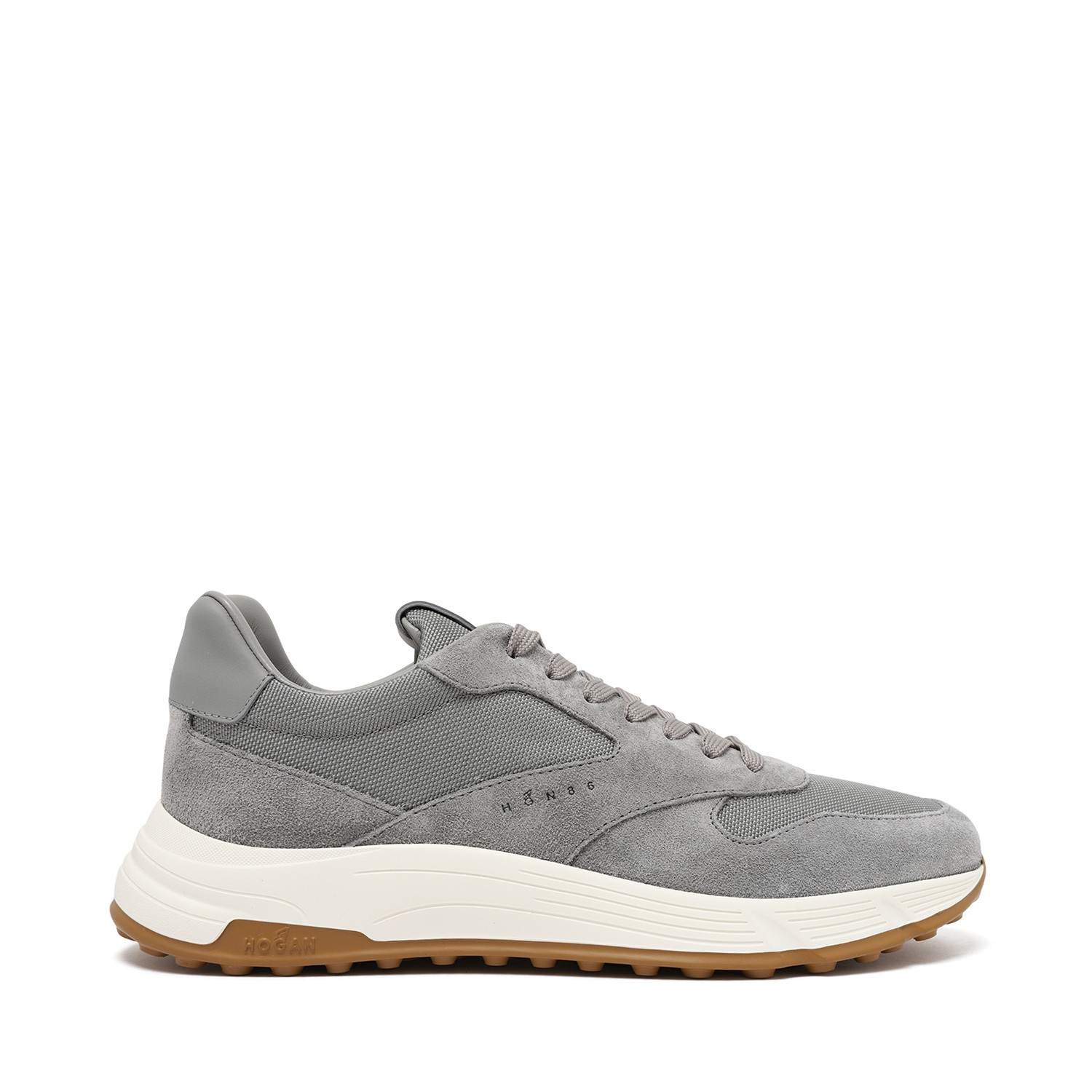 Hogan Grey Suede and Leather Sneakers. Grey low-top sneakers defined by a sporty yet refined silhouette and signature Hogan craftsmanship. Crafted from a combination of soft suede and smooth leather, these sneakers feature tonal paneling that enhances depth and texture while maintaining a clean, contemporary aesthetic. The lace-up closure ensures a secure fit, while the padded collar and cushioned interior provide lasting comfort throughout the day. Set on a lightweight rubber sole with a slightly elevated profile, the design offers excellent support and flexibility. Finished with subtle Hogan branding and precise detailing, they embody the brand