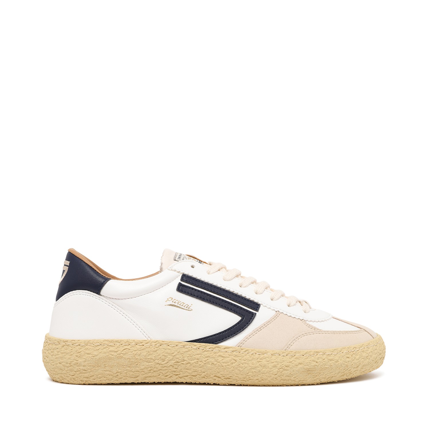 Puraai White Leather and Suede Sneakers. White low-top sneakers defined by a clean, contemporary silhouette and sustainable Puraai craftsmanship. Crafted from smooth leather with soft suede overlays, these sneakers feature contrasting navy side detailing that adds a dynamic, sporty accent to the minimalist design. The lace-up closure ensures a secure fit, while the padded collar and soft lining provide lasting comfort for everyday wear. Set on a textured natural rubber sole with a slightly chunky profile, the design offers durability, grip, and a distinctive modern edge. Finished with precise stitching and refined panel construction, they embody the brand