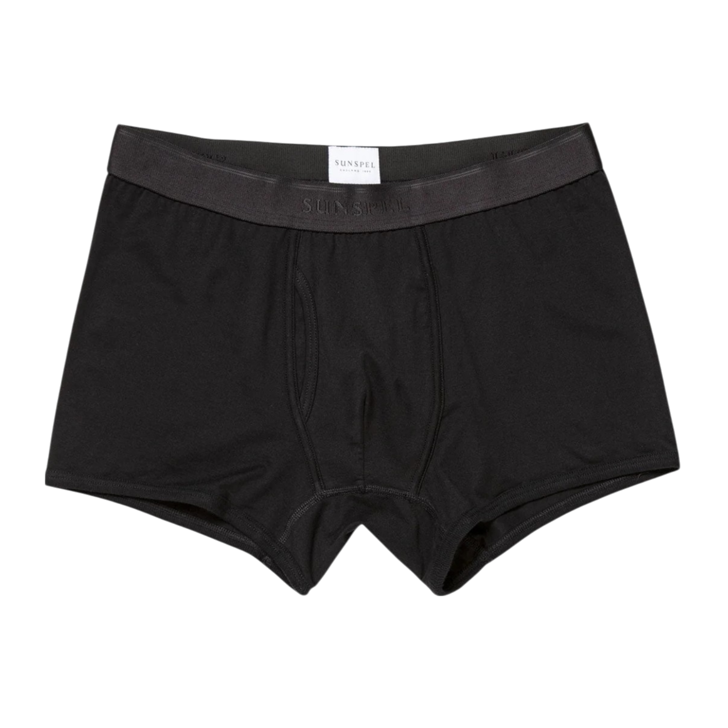 Sunspel Black Superfine Cotton Trunks. The front opening trunk combines the fit of a boxer short with the support of a brief. Made from luxuriously soft, lightweight long-staple cotton jersey. Elasticated hems ensure a comfortable fit throughout the day.
