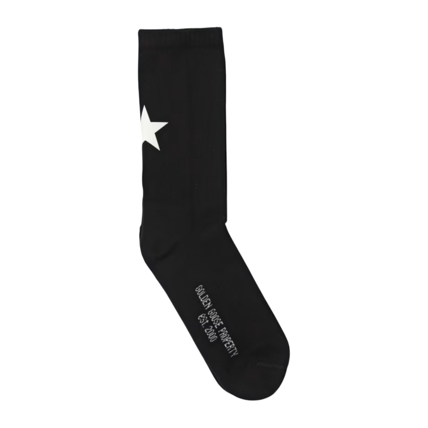 Golden Goose Black Star Socks in Stretch Cotton. Black cotton socks with logo contrasting, calf length, monogram print.