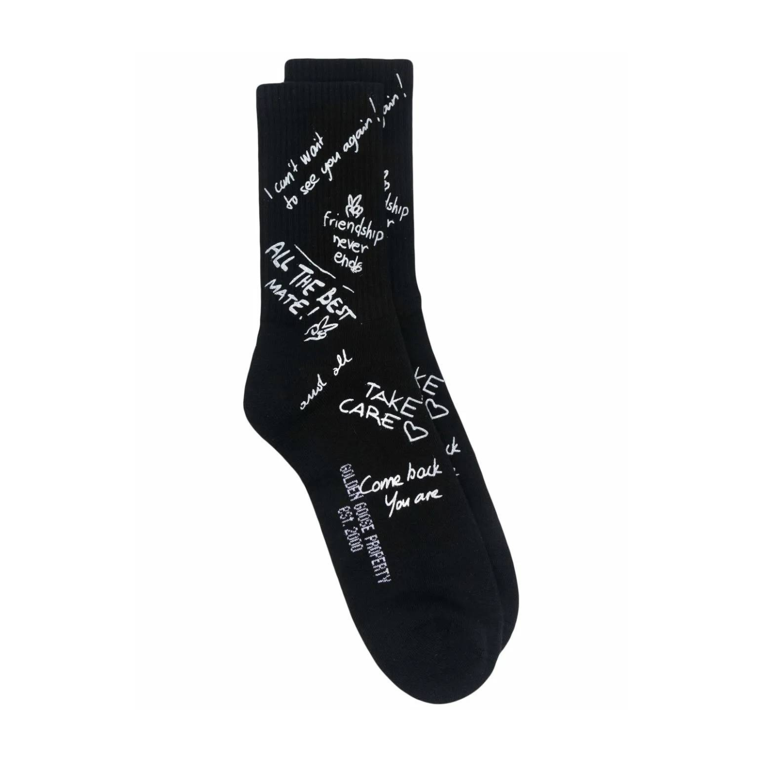 Golden Goose Black Socks With Scribbled Print. Black crafted from stretch cotton socks embellished with a series of positive slogans on the outside. Made in Italy, they feature black and white stretch cotton details, a round toe, and an elasticated design.