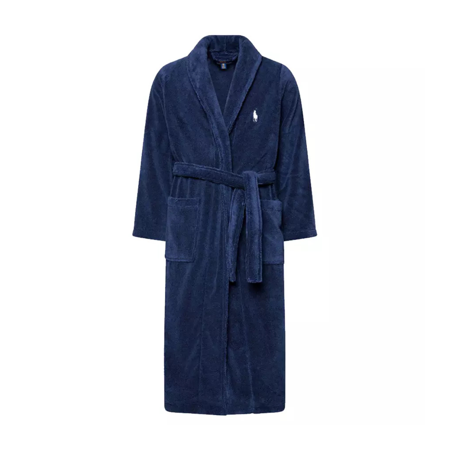 Polo Ralph Lauren Navy Blue Cotton Bathrobe. Navy blue cotton bathrobe with logo embroidered to the front, belt.