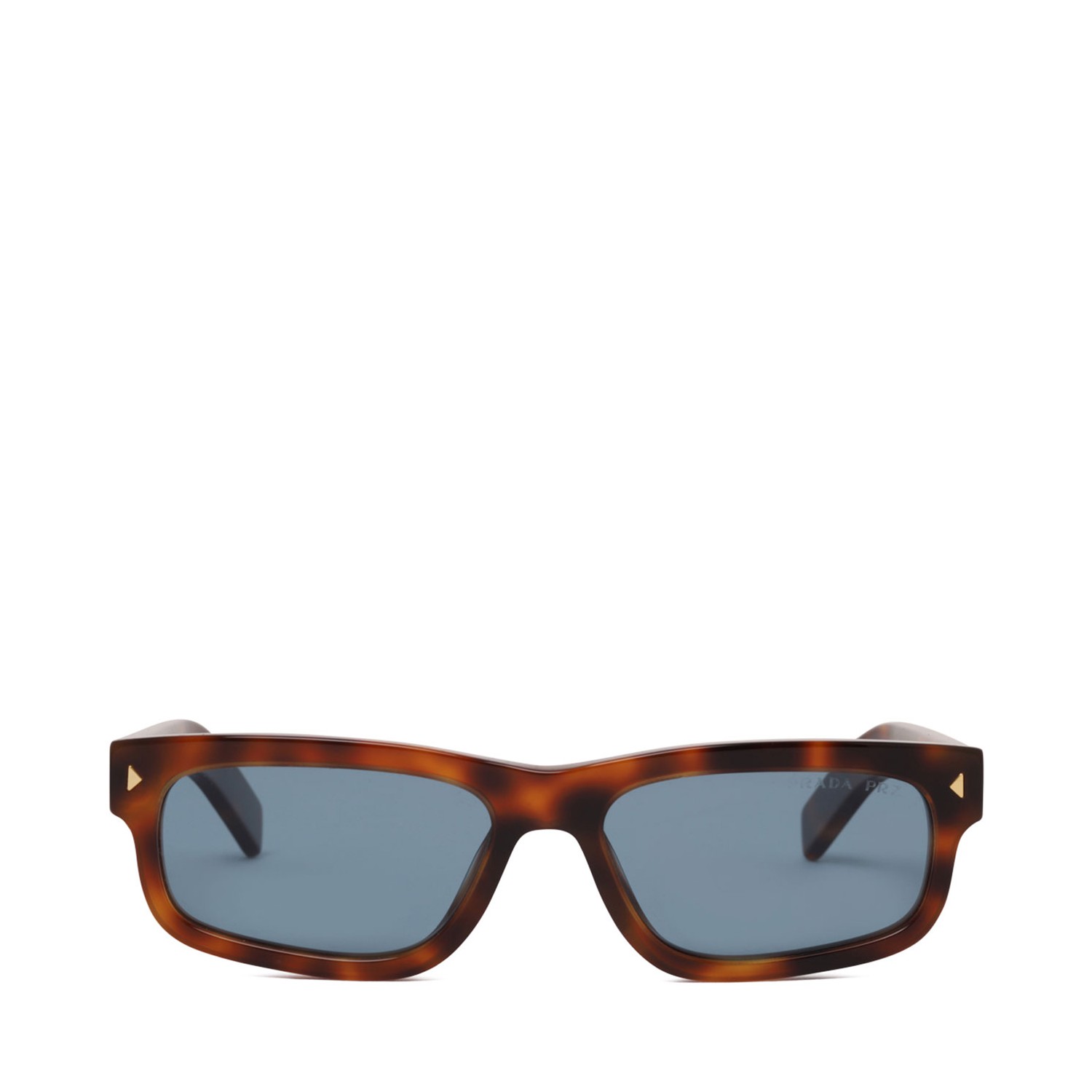 Prada Brown Rectangular Sunglasses. Brown sunglasses featuring a rectangular acetate frame with blue lenses. The temples are adorned with a sleek metal stripe detail and the Prada logo. The frame is lightweight yet durable, offering a comfortable fit. The lenses provide UV protection, ensuring both style and functionality.