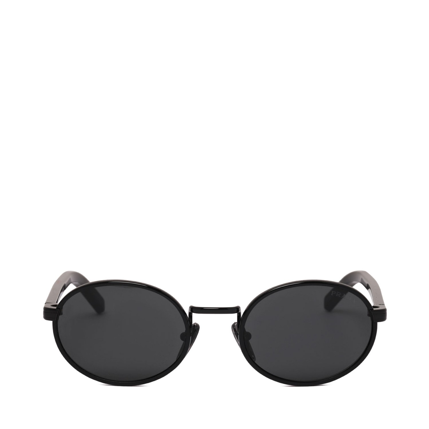 Prada Black Oval Sunglasses. Black sunglasses with a contemporary and elegant style. The oval front is outlined by refined metal profiles and combined with sophisticated acetate temples signed by the Prada logo finely engraved on the metal plate.