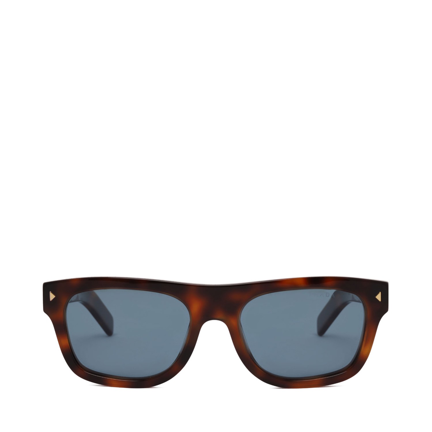 Prada Tortoiseshell Rectangular Sunglasses. Stylish sunglasses featuring a rectangular acetate frame in a classic tortoiseshell finish. The blue-tinted lenses provide a modern contrast, while the temples are accented with a sleek metal stripe and Prada logo. Lightweight yet durable, these sunglasses offer both elegance and UV protection for everyday wear.