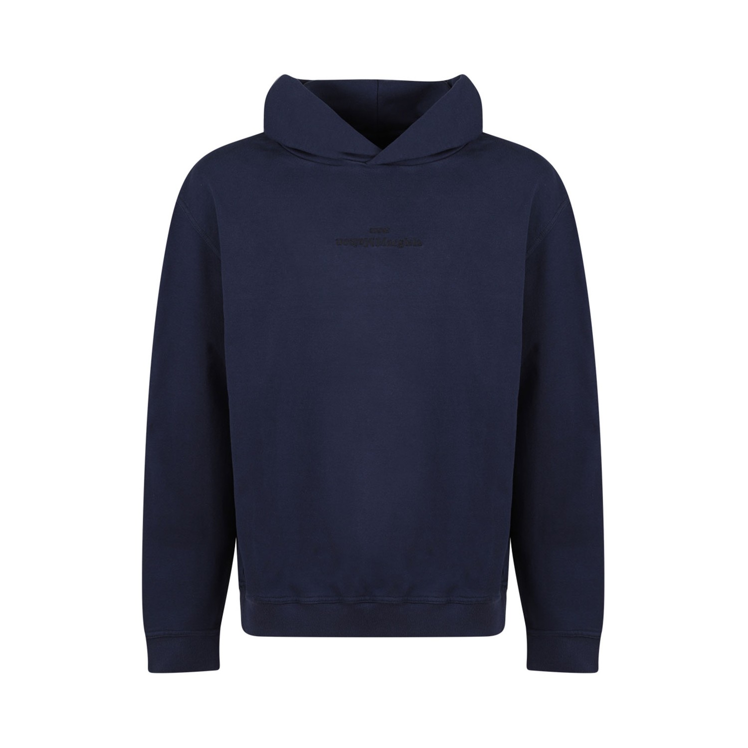 Maison Margiela Dark Blue Hoodie. Dark blue cotton hoodie, embroidered logo at the chest, classic hood, drop shoulder. Long sleeves, ribbed trim, straight hem.