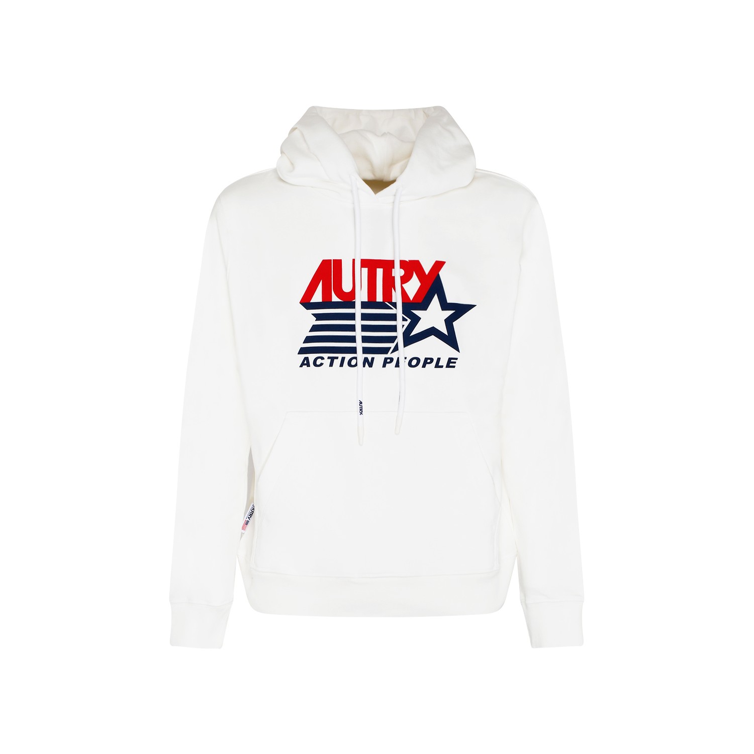 Autry White Cotton Logo Print Drawstring Hoodie. White cotton hoodie, logo print to the front, graphic print to the front. Long sleeves, front pouch pocket, drawstring hood and straight hem.