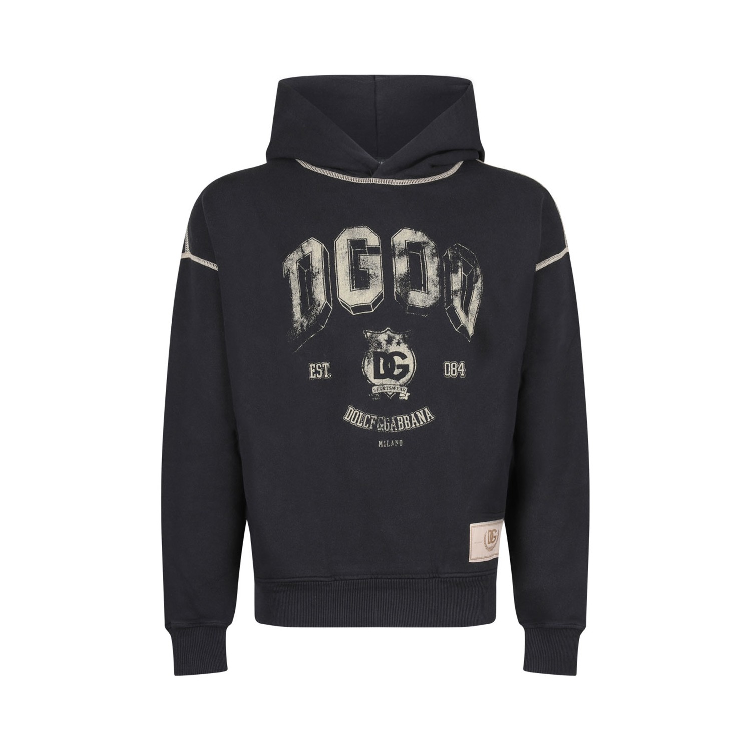 Dolce & Gabbana Black DG Print Hoodie. Black cotton hoodie, logo print to the front, logo patch to the front. Contrast stitching, classic hood, drop shoulder, ribbed cuffs and hem.