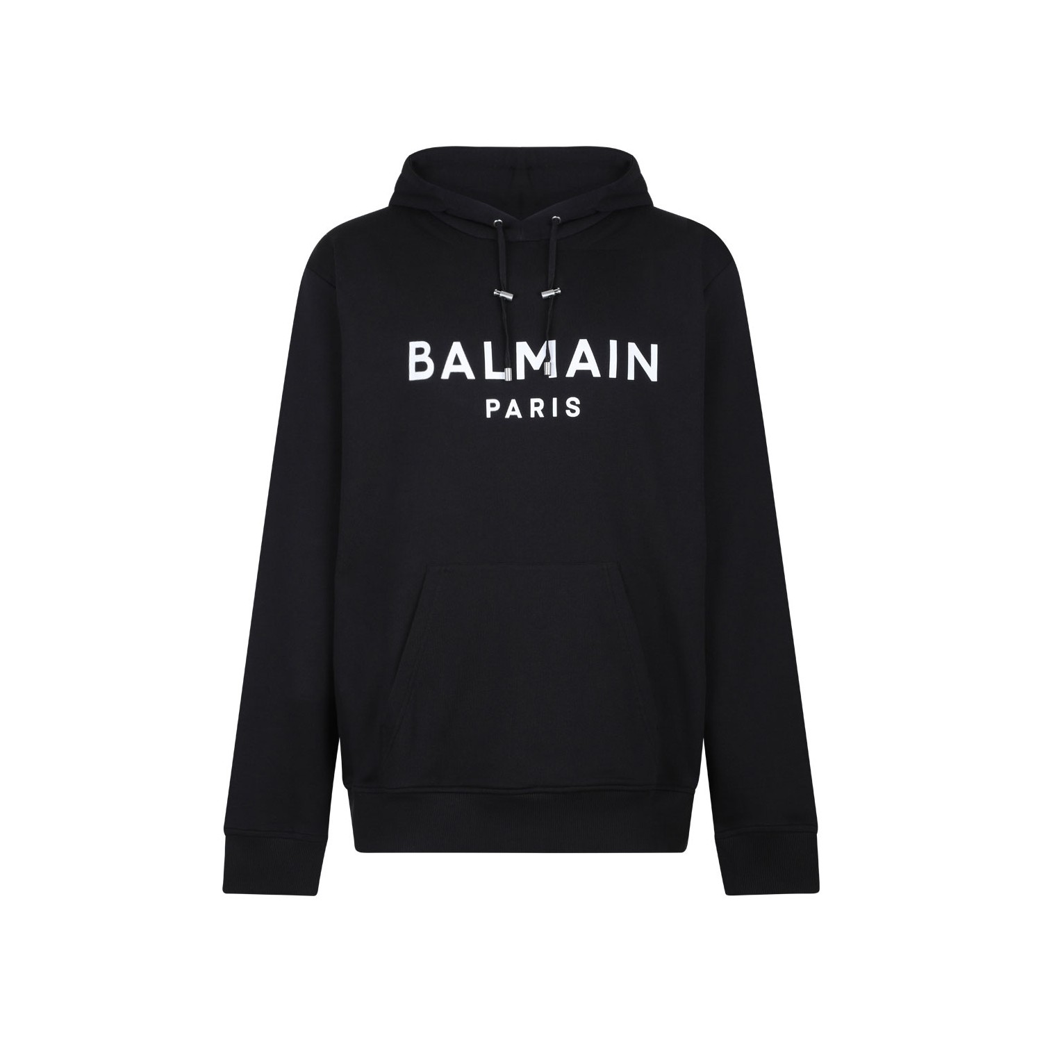 Balmain Black Logo Print Hoodie. Black cotton hoodie, logo print at the chest, drawstring hood, front pouch pocket. Long sleeves, straight hem.