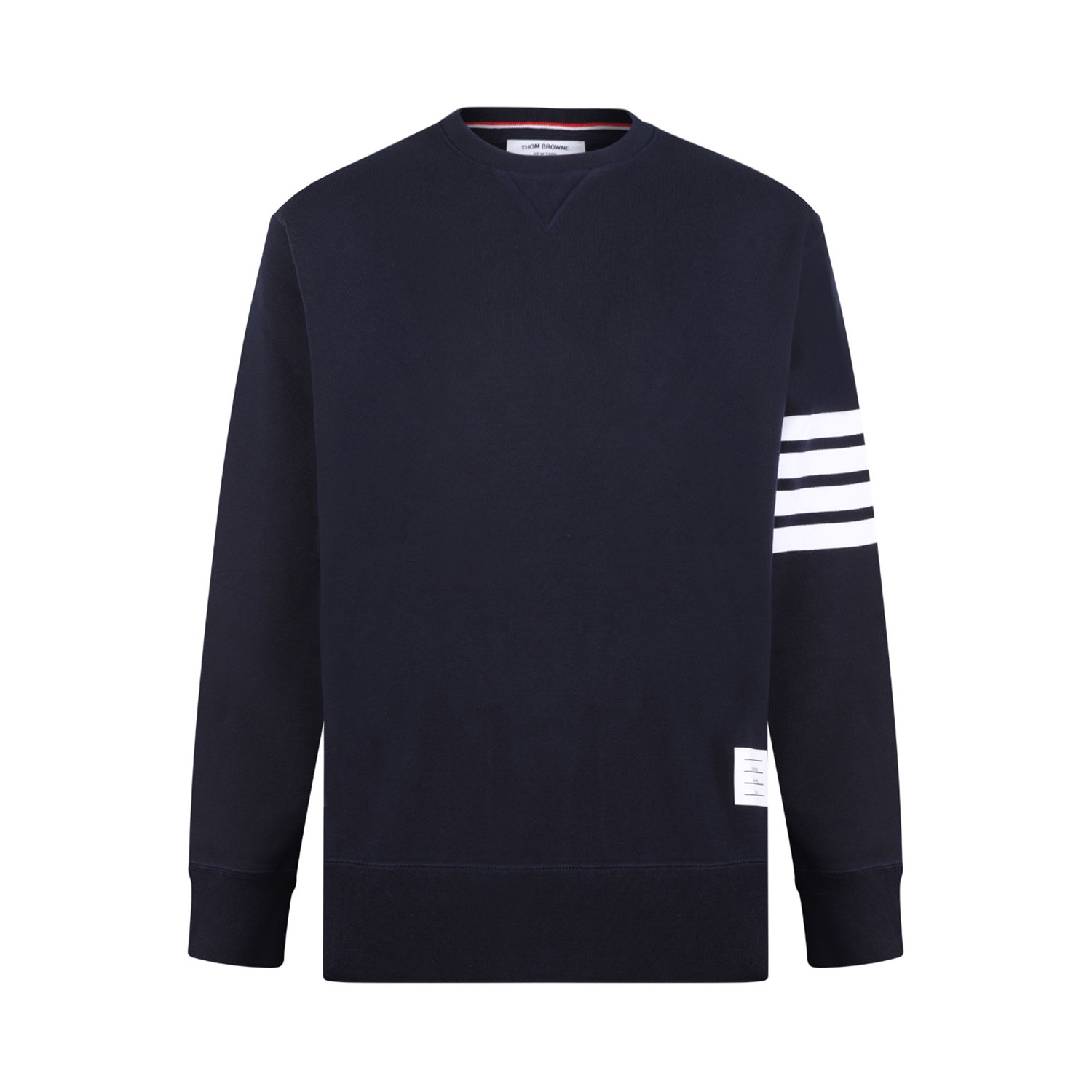 Thom Browne Navy Blue 4-Bar Stripe Sweatshirt. Navy blue cotton sweatshirt with crew neck, signature grosgrain loop tab, drop shoulder. Long sleeves, signature 4-Bar, stripe logo patch to the front.