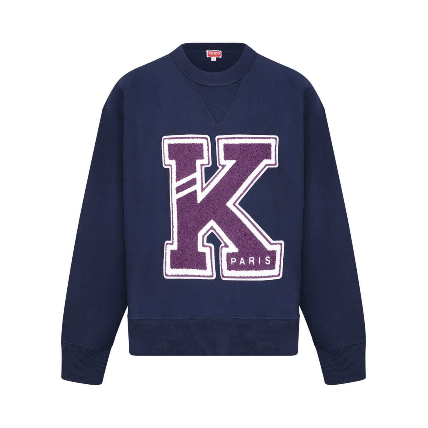 Kenzo Midnight Blue Logo-Applique Sweatshirt. Midnight blue cotton sweatshirt with jersey fleece, applique logo to the front, elephant patch to the rear. Ribbed detailing to the side, crew neck, drop shoulder, long sleeves, ribbed cuffs and hem.