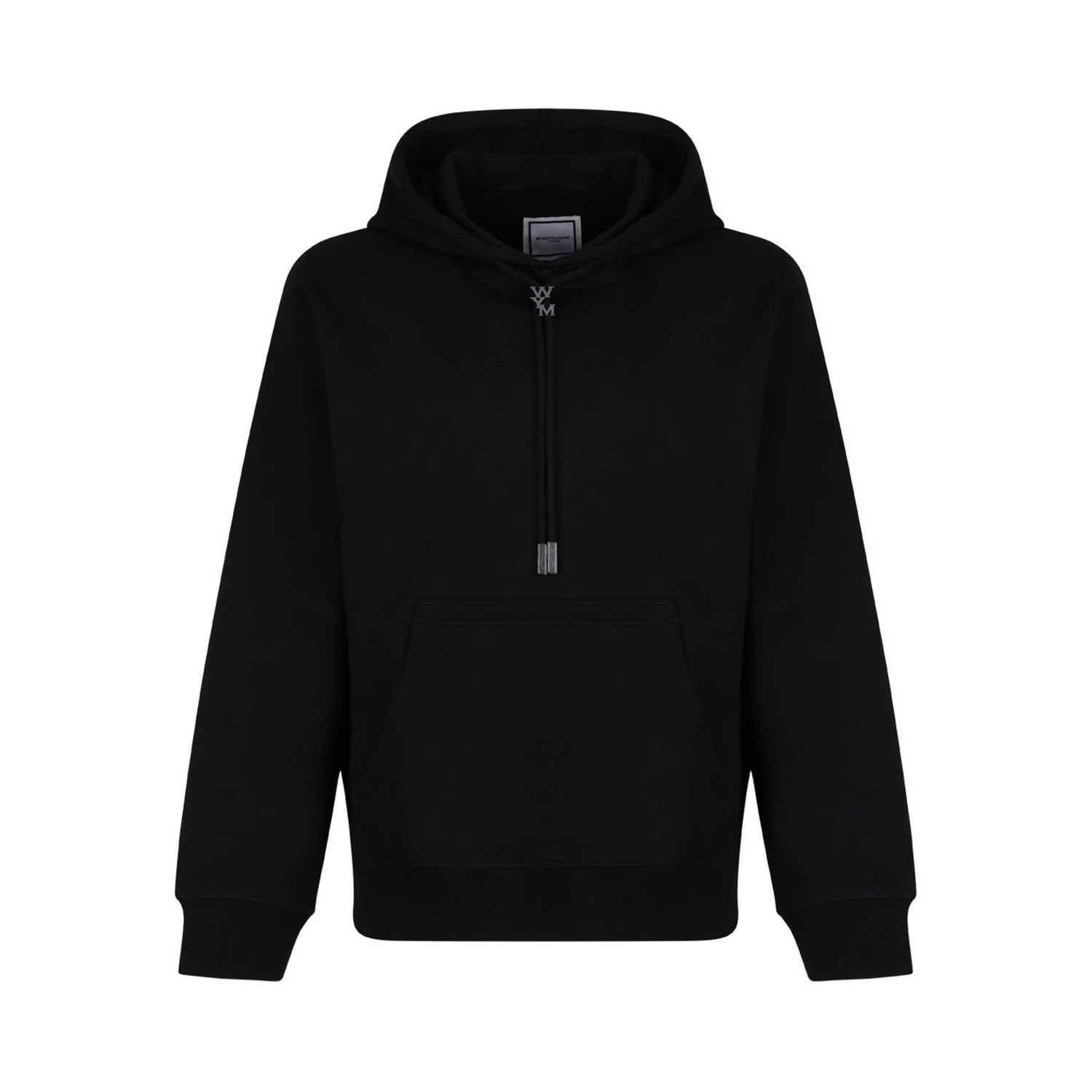 Wooyoungmi Black Logo Print Hoodie. Black cotton hoodie with elasticated fastening, long sleeves and white logo print to the rear.