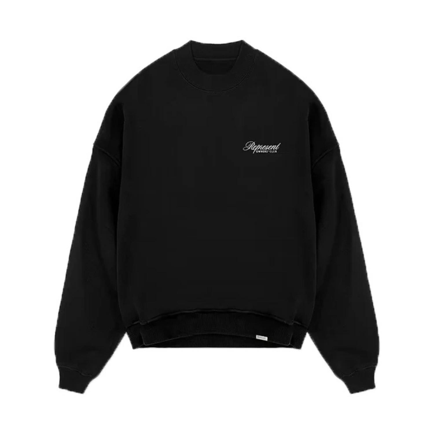 Represent Black Owners Club Script Sweatshirt. Black cotton sweatshirt with long sleeves, crew neck, logo print to the front and to the rear.