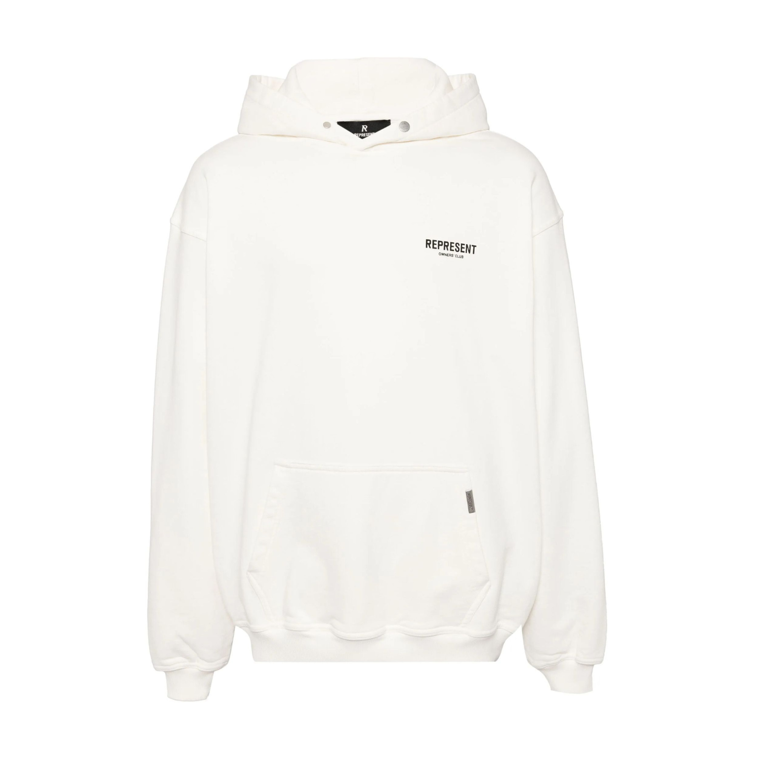Represent White Owners Club Hoodie. White cotton hoodie with jersey texture, logo print at the chest, logo print to the rear, classic hood. Drop shoulder, long sleeves, ribbed cuffs, front pouch pocket and French terry lining.