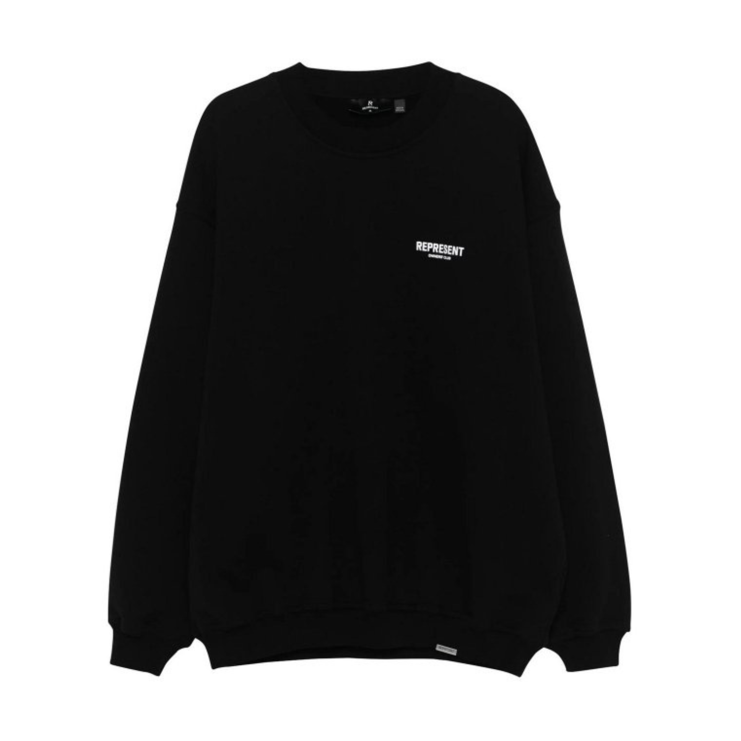 Represent Black Logo Print Sweatshirt. Black knitted texture sweatshirt with crew neck, logo print on chest, dropped shoulders, long sleeves, ribbed hem and cuffs, logo print on back, terry, straight hem.