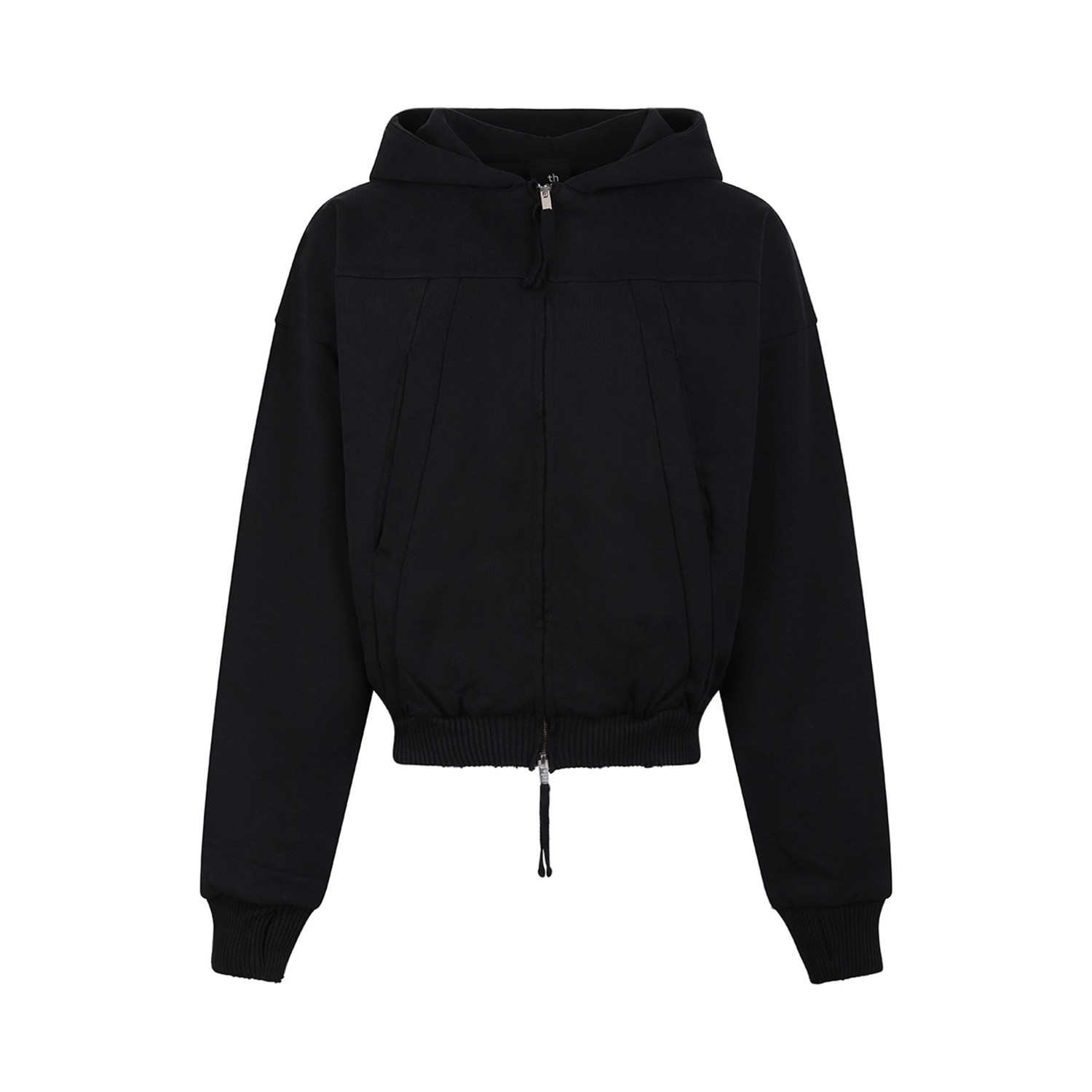 Thom Krom Black Zip-Up Hoodie With Hand Gaiters. Black cotton jersey hoodie with fixed hood with embroidered logo. Zip closure, side pockets, dropped shoulders. Cuffs with hand gaiters, distressed ribbed hem and cuffs.
