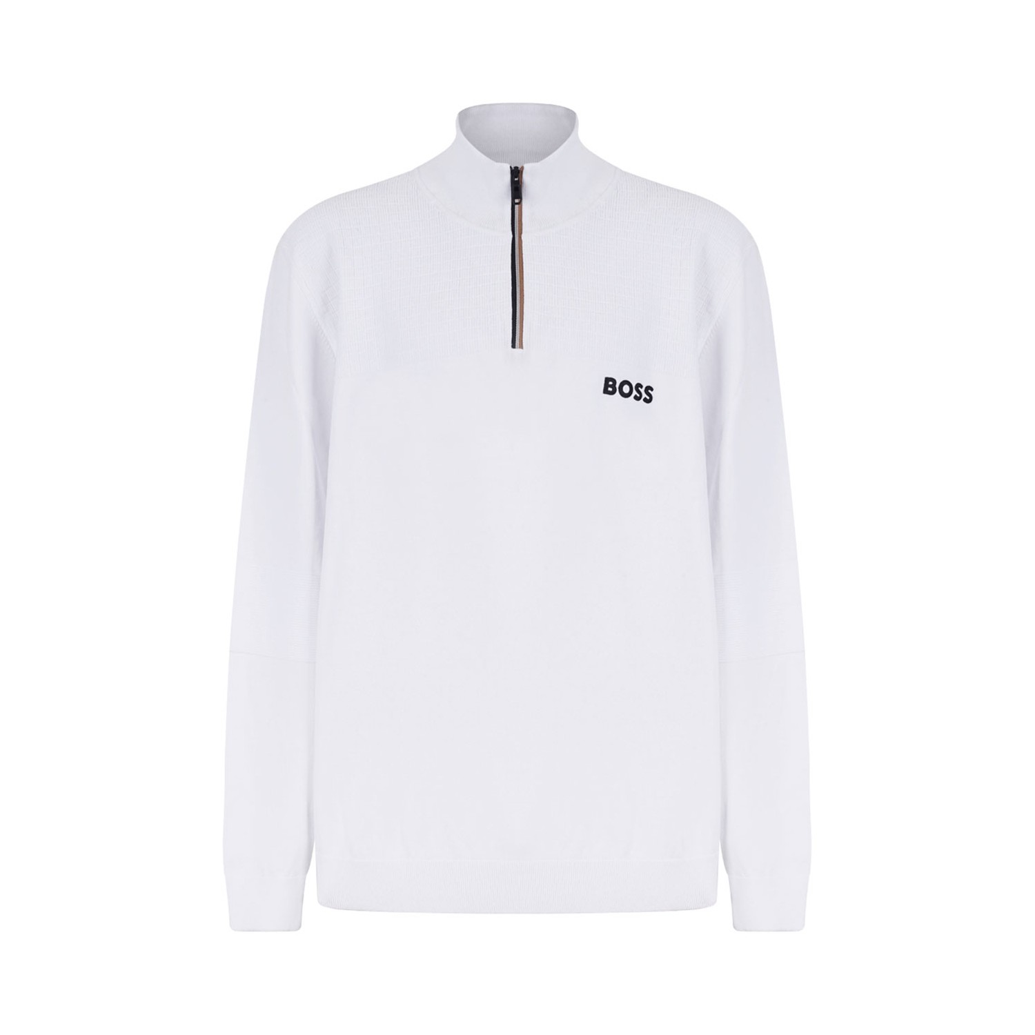 Boss Green White Zip-Neck Sweatshirt. White zip-neck sweatshirt with embroidered BOSS By Hugo Boss logo, high collar and zip, easticated waist and cuffs.