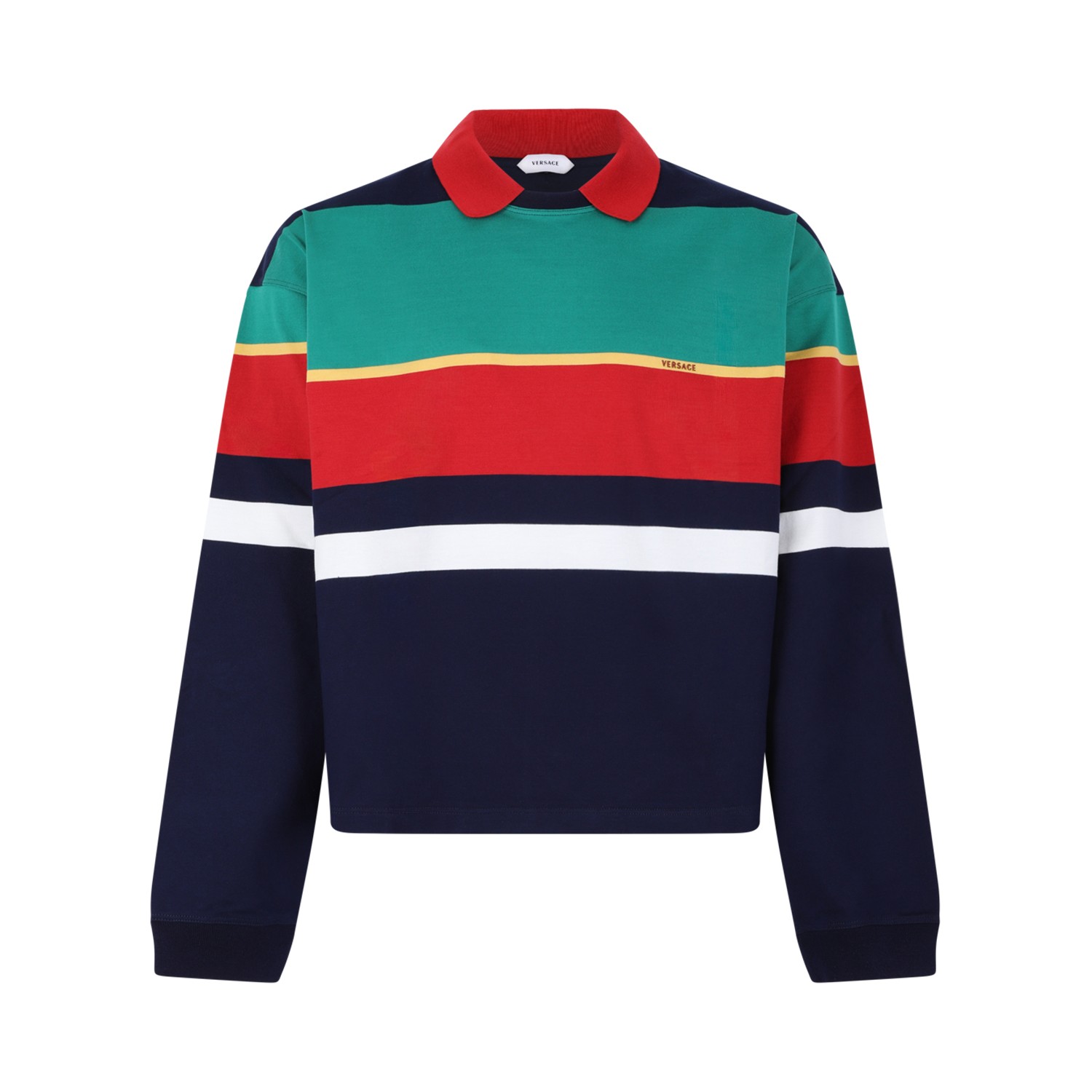 Versace Multicolor Striped Cotton Sweatshirt. Multicolor sweatshirt defined by a bold, sporty aesthetic. Crafted from soft premium cotton, this Versace sweatshirt features a relaxed silhouette enhanced by a classic pointed collar and long sleeves with ribbed cuffs for everyday comfort. The design stands out with vibrant horizontal color-block stripes in green, red, navy, yellow, and white, creating a dynamic and contemporary visual impact. The clean lines and structured fit are balanced by the casual athletic inspiration, while subtle branding adds a refined designer touch. Finished with careful detailing and high-quality construction, this sweatshirt reflects Versace