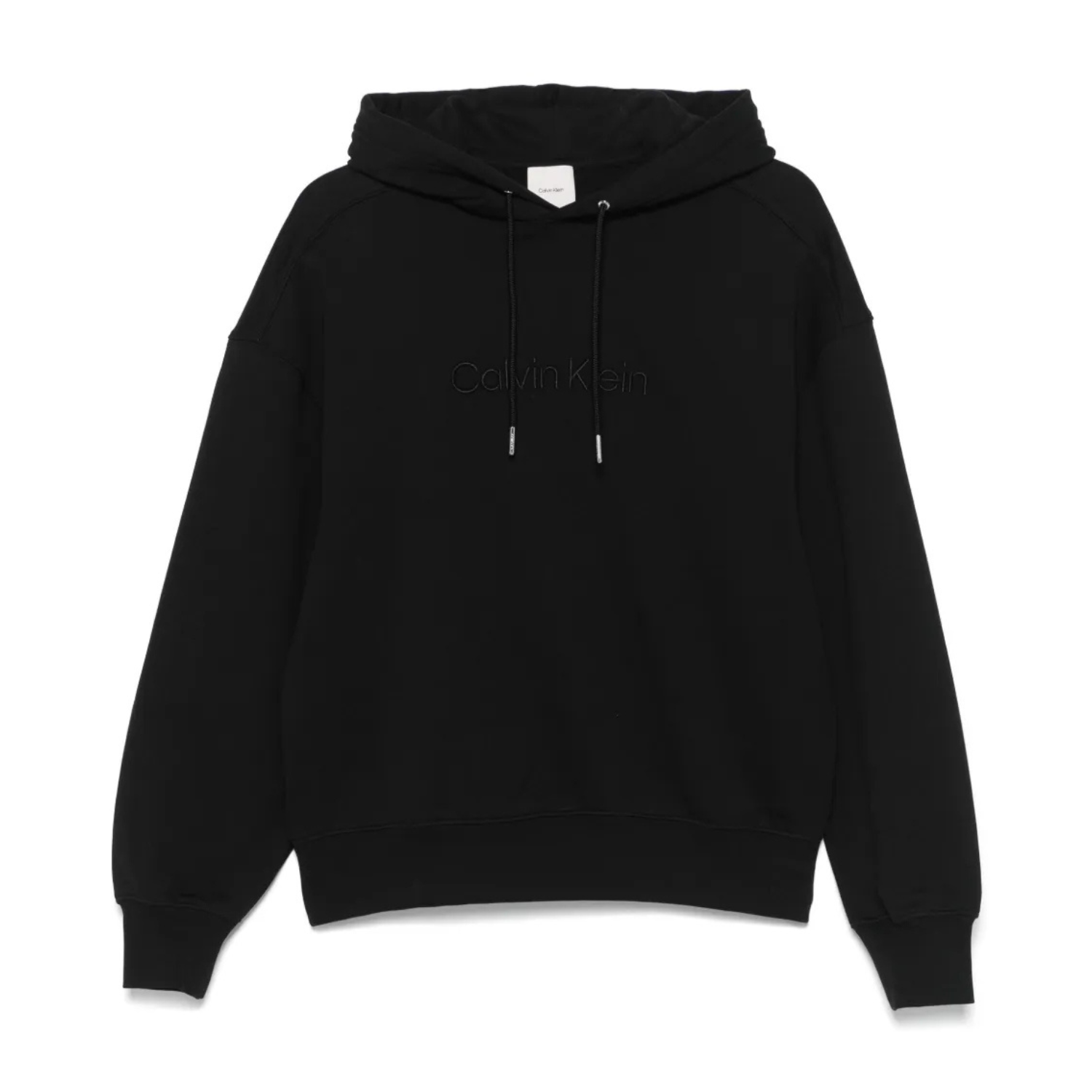 Calvin Klein Black Logo-Embroidered Hoodie. Black cotton hoodie with logo embroidered to the front, drop shoulder, long sleeves, ribbed cuffs and hem.