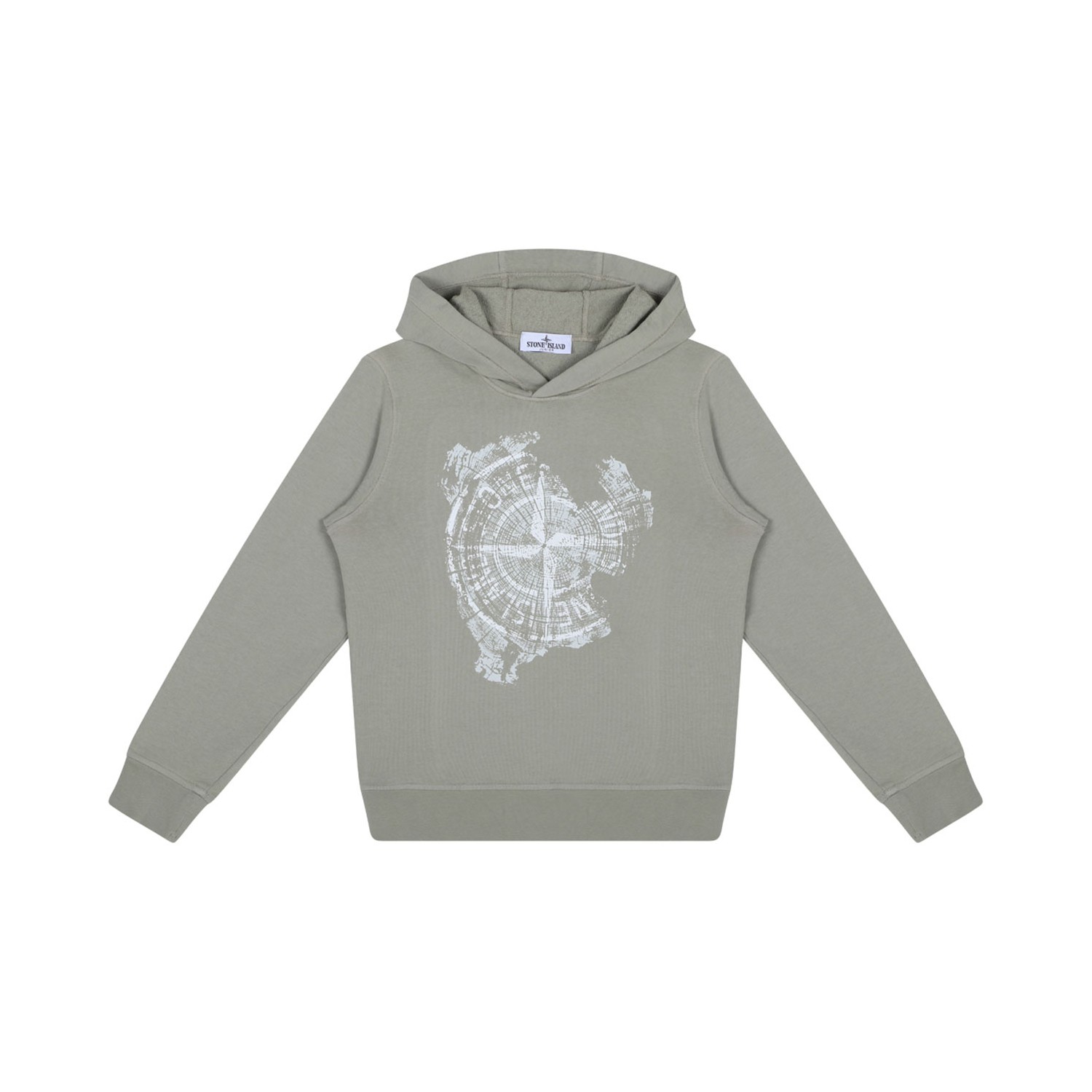 Stone Island Light Grey Hoodie. Light grey cotton hoodie. Crew neck, long sleeve, print logo on front.