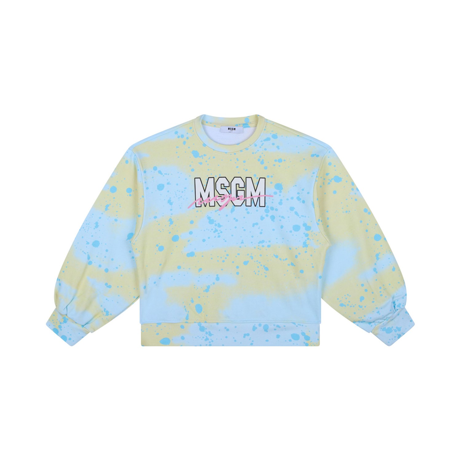 MSGM Kids Logo Print Sweatshirt. Light yellow and light blue cotton sweatshirt with logo print to the front, paint splatter detail, spray-paint effect, ribbed cuffs and hem.