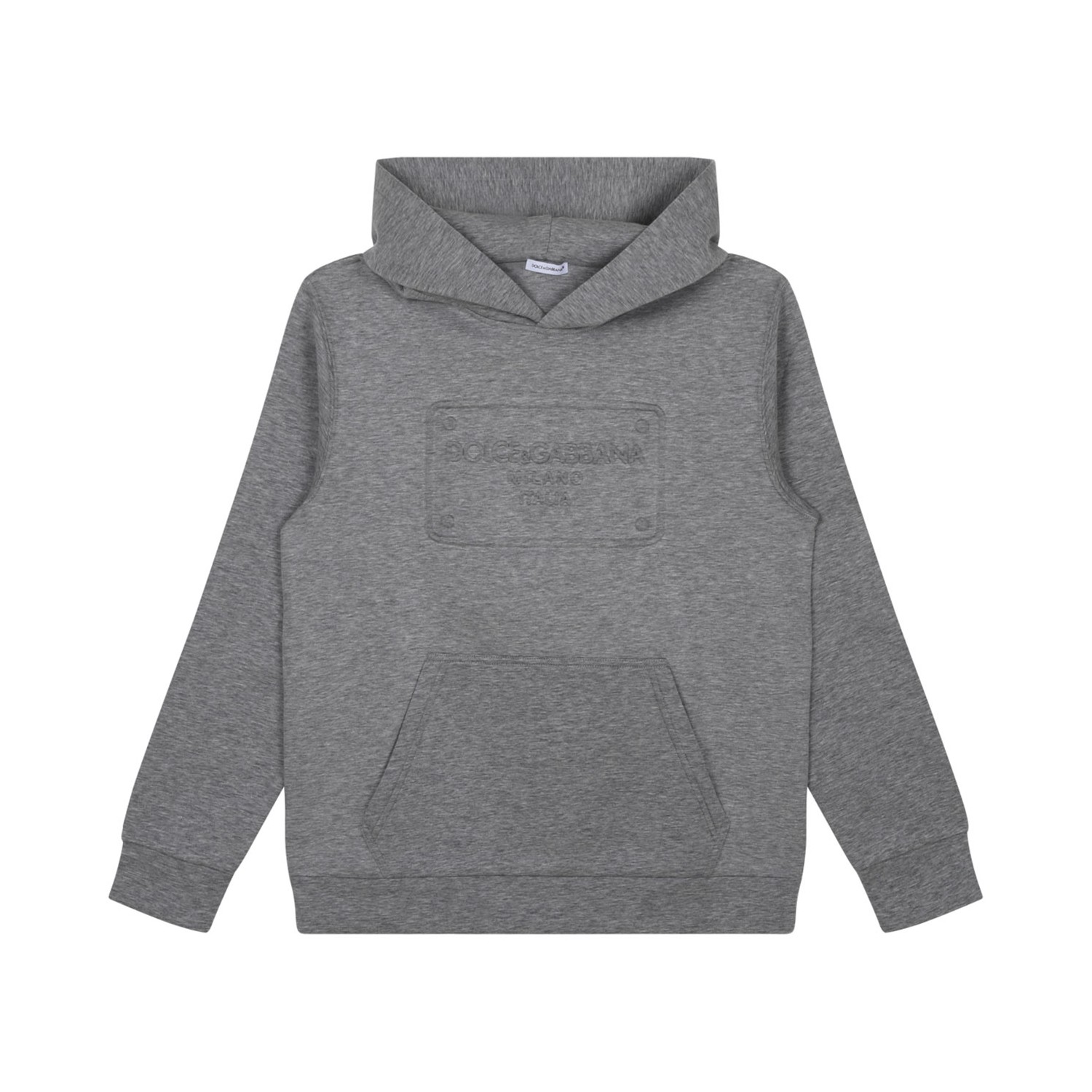 Dolce & Gabbana Kids Grey Logo Print Hoodie. Grey cotton hoodie, jersey texture, melange effect, logo print to the front. Classic hood, front pouch pocket, long sleeves, ribbed edge, staright hem.