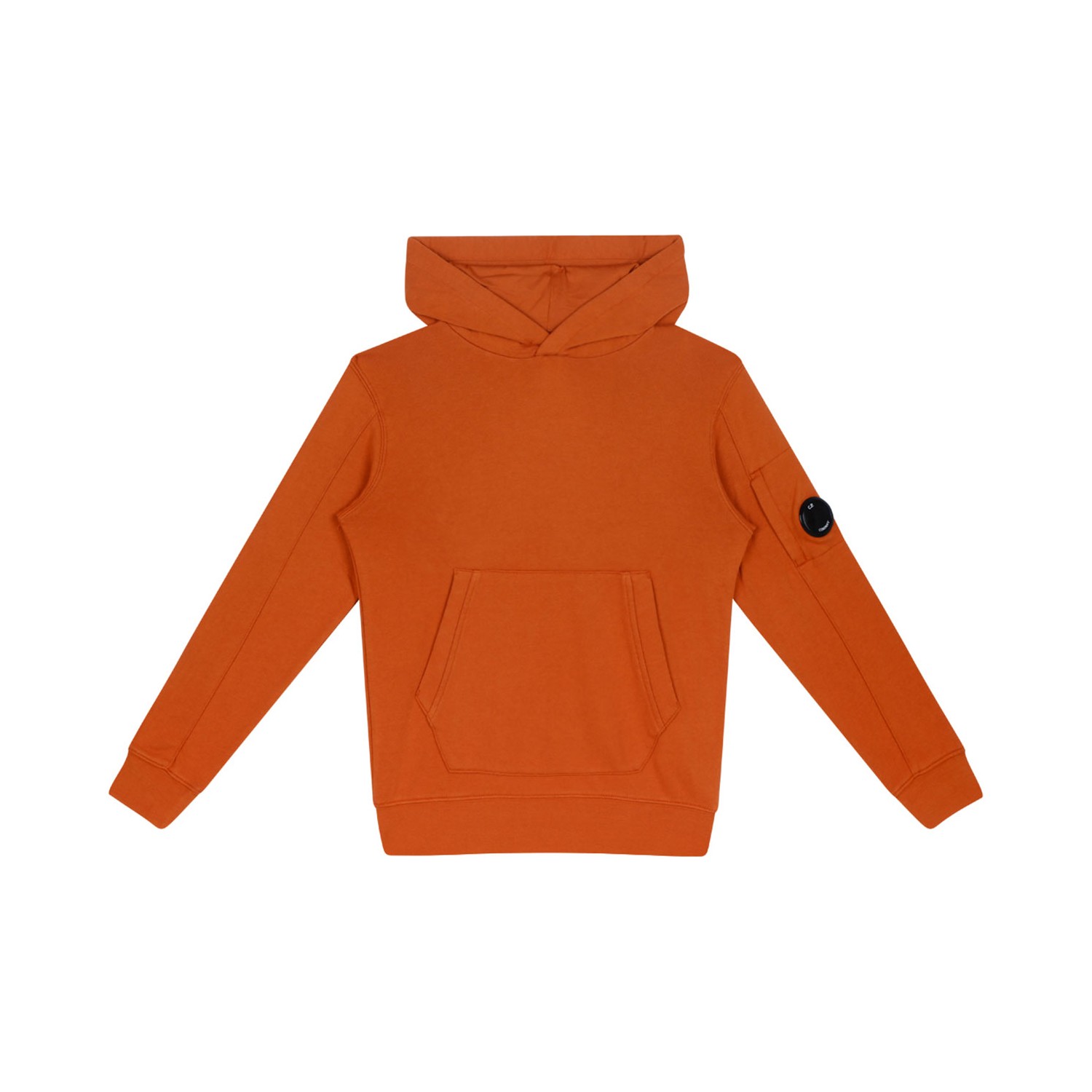 C.P. Company Kids Orange Rust Hoodie. Orange rust cotton hoodie, logo patch to the sleeve, long sleeves, kangaroo pocket.