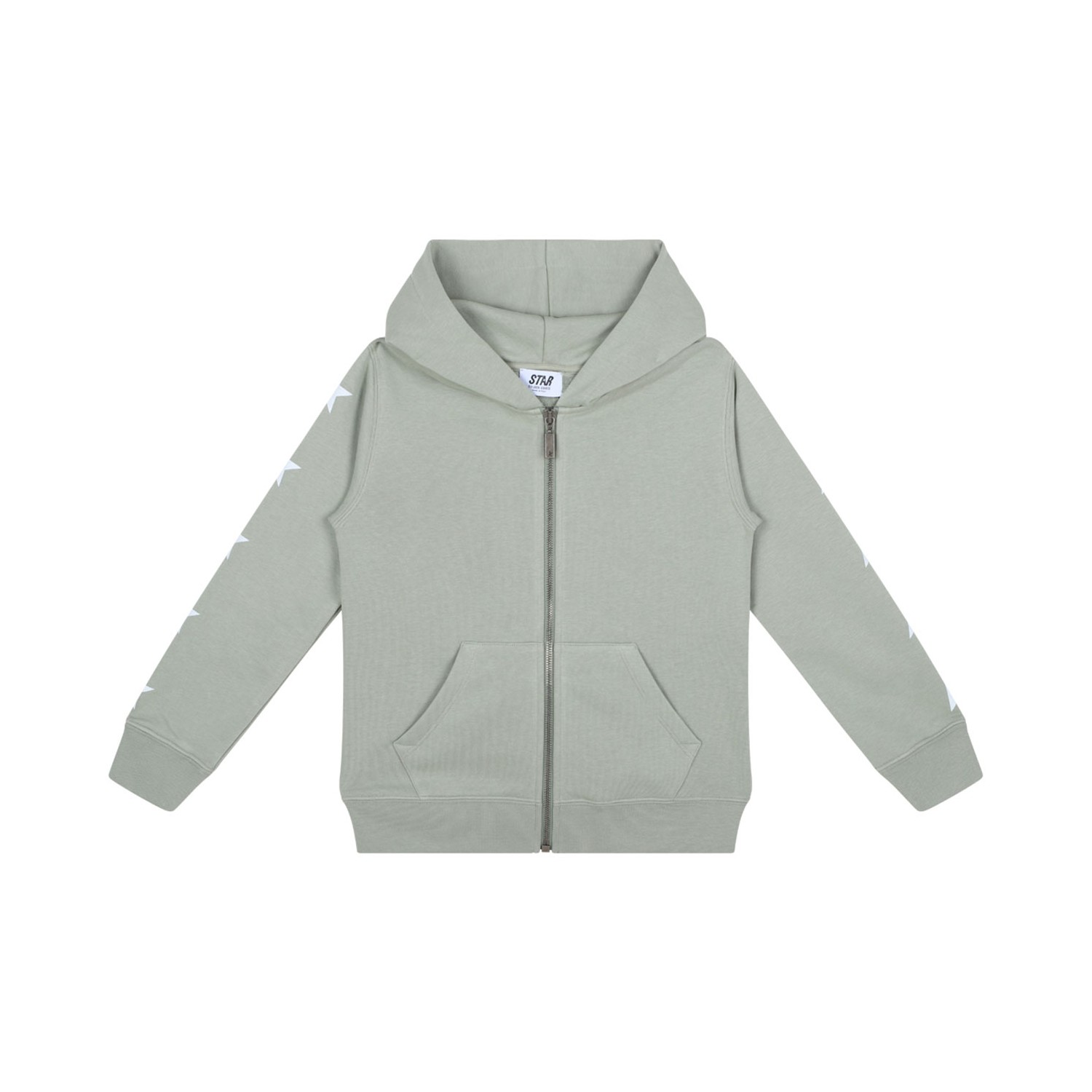 Golden Goose Kids Sage Green Hoodie. Sage green cotton hoodie, front zip fastening, front pouch pocket, slouchy hood, star print to the sleeves, ribbed cuffs and hem.