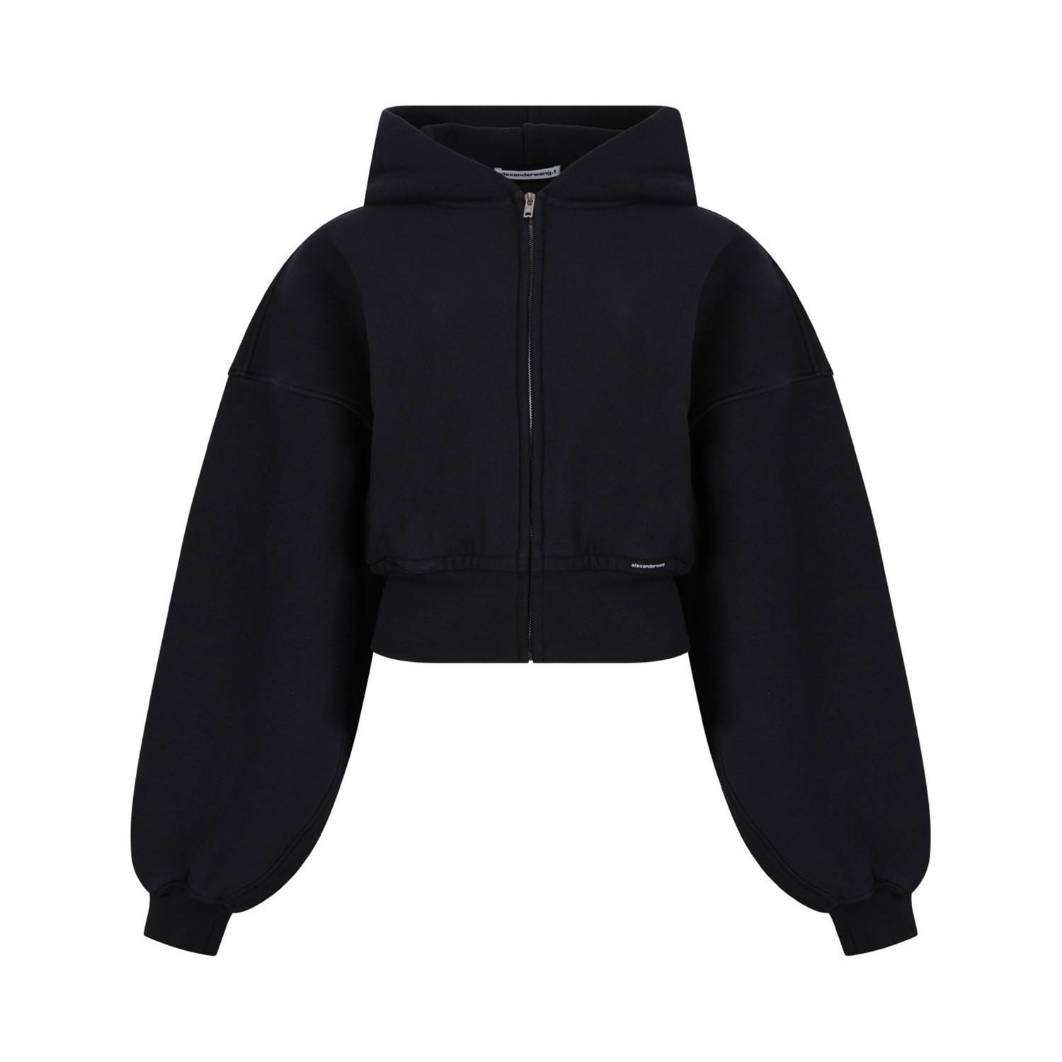 Alexander Wang Faded Black Cropped Hoodie. Faded black cropped zip up hoodie in classic unbrushed terry with matching rib trim at hem and cuffs, wavy zipper, and logo label at left ribbed hem.