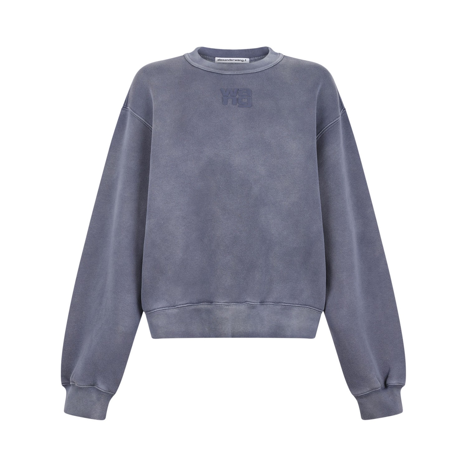 Alexander Wang Washed Blue Ink Logo-Embossed Sweatshirt. Washed blue ink cotton sweatshirt with logo-embossed to the front, crew neck, drop shoulder, long sleeves, ribbed cuffs and hem.