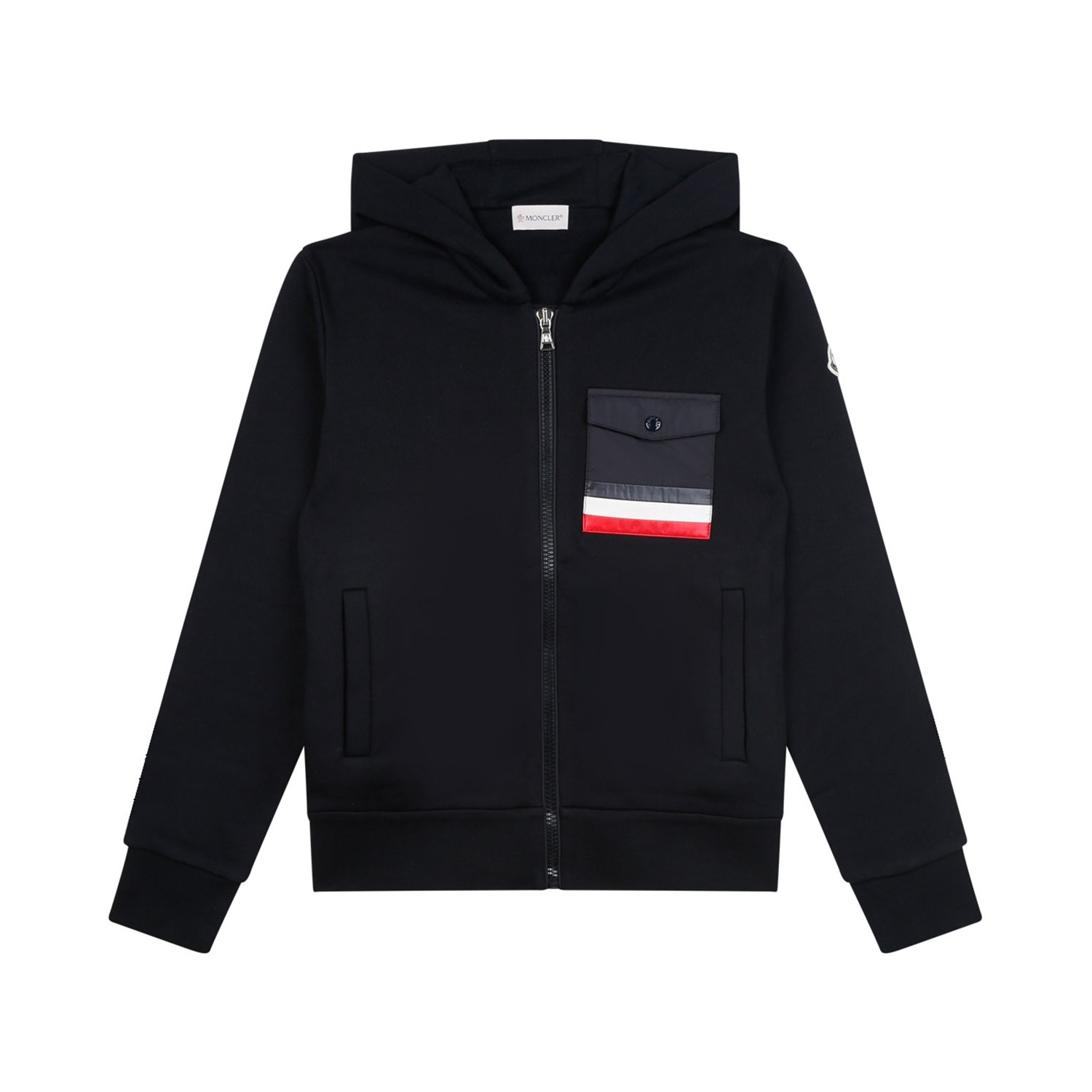 Moncler Kids Navy Blue Zip Up Cardigan. Navy blue cotton cardigan, front zip fastening, classic hood, patch pocket to the front with grossgrain logo.
