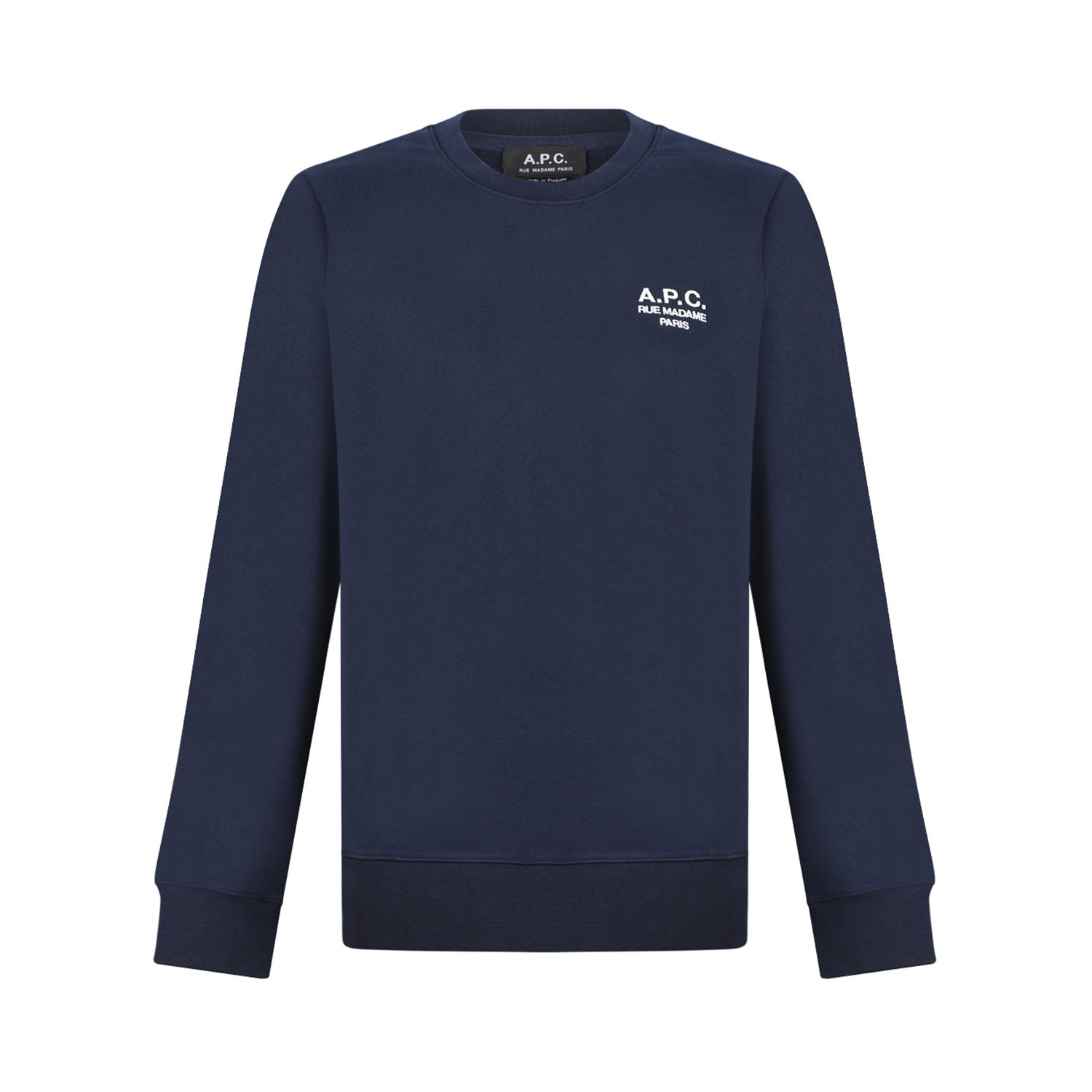 A.P.C. Navy Blue Skye Logo-Embroidered Cotton Sweatshirt. Navy blue cotton sweatshirt with 'Rue Madame Paris' logo at the chest, crew neck and long sleeves.