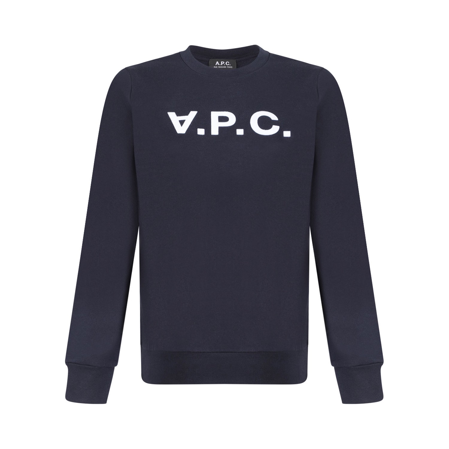 A.P.C. Navy Blue VPC Logo-Print Cotton Sweatshirt. Navy blue cotton sweatshirt with crew neck, logo print at the chest, long sleeves, straight hem and ribbed edge.