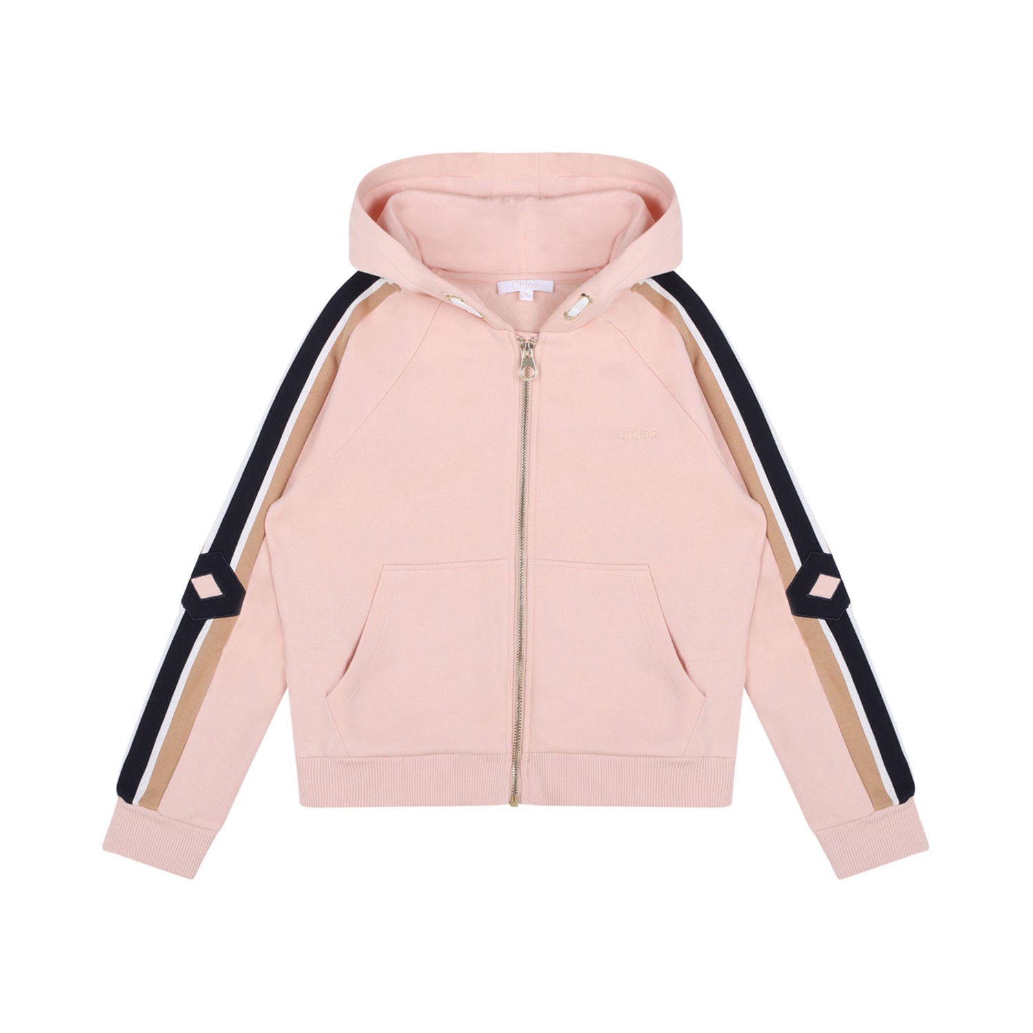 Chloe Kids Blush Pink Jersey Fleece Hoodie. Blush pink cotton hoodie with jersey fleece, side stripe detailing, drawstring hood. Front zip fastening, long sleeves, two front pouch pockets and straight hem.