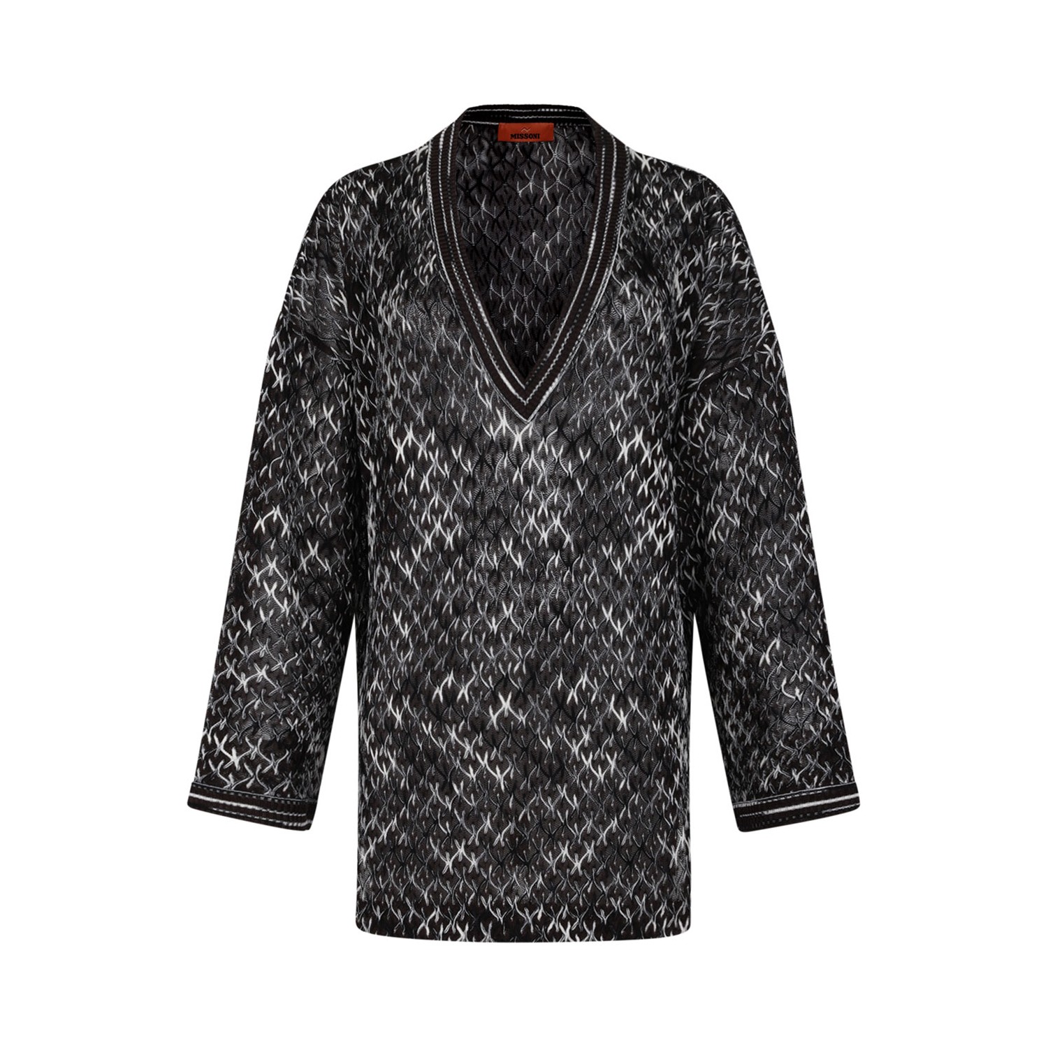 Missoni Black and Brown Crew Neck Sweater With Flame Motif. Black and brown long-sleeved crew neck sweater with slub stocking stitch work and mixed wool.