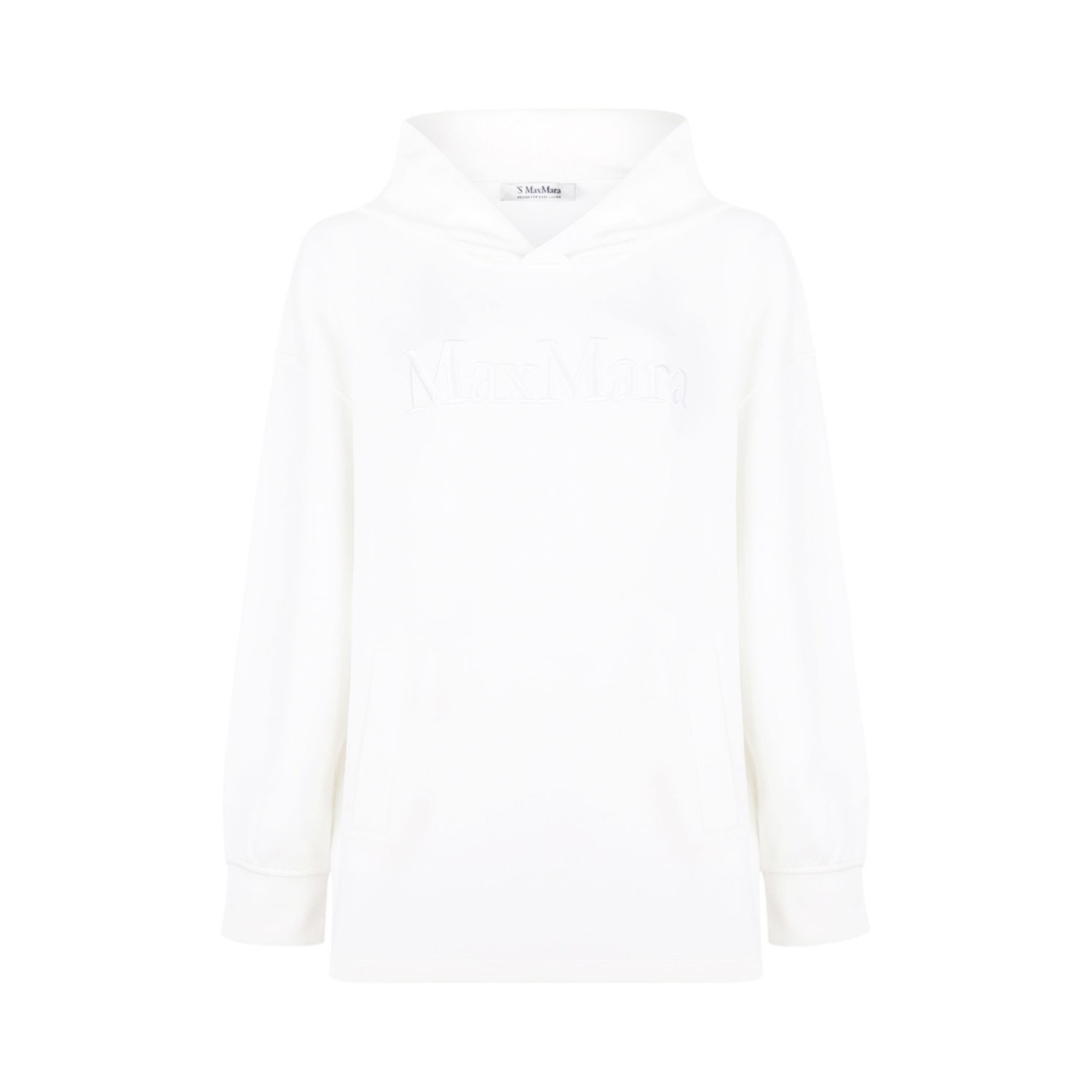 Max Mara White Oversized Sweatshirt. White oversized volume hoodie in technical cotton jersey. Long sleeves with low set-in, welt pockets on the front. Max Mara logo embroidered in tone on the chest, ribbed cuffs, straight bottom.