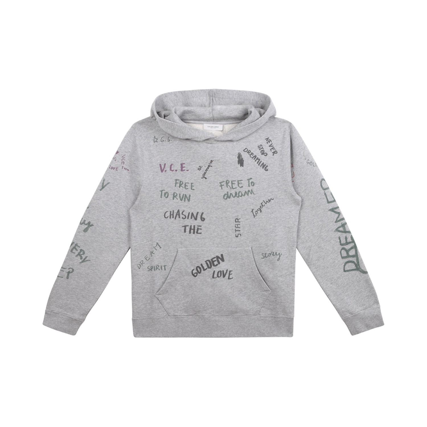 Golden Goose Kids Light Grey Graphic Print Hoodie. Light grey cotton hoodie with all over graphic print, long sleeves and kangaroo pocket to the front.