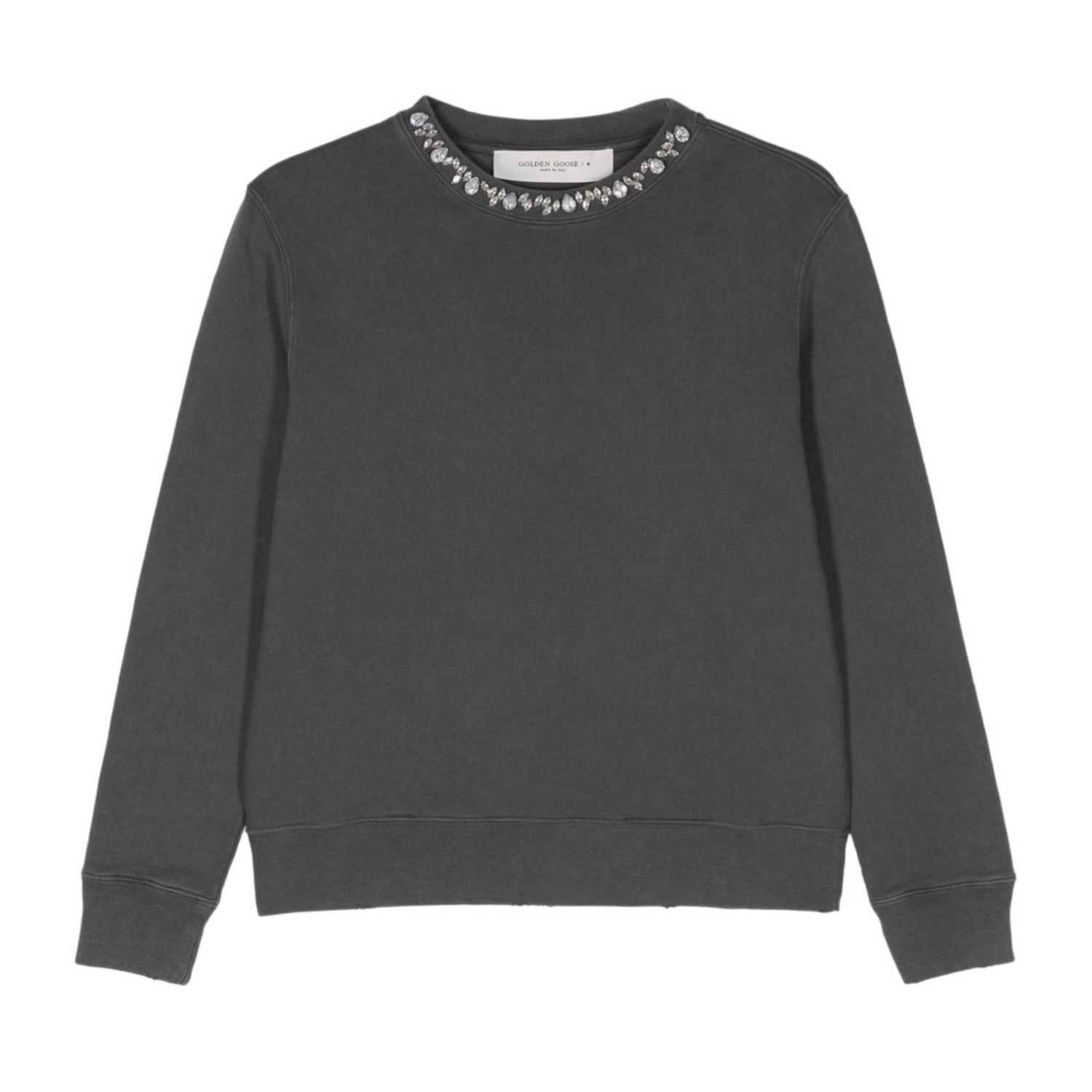 Golden Goose Anthracite Grey Sweatshirt With Crystals. Anthracite grey cotton sweatshirt, cabochon crystals applied on the neck, double gold star on the back, long sleeves.