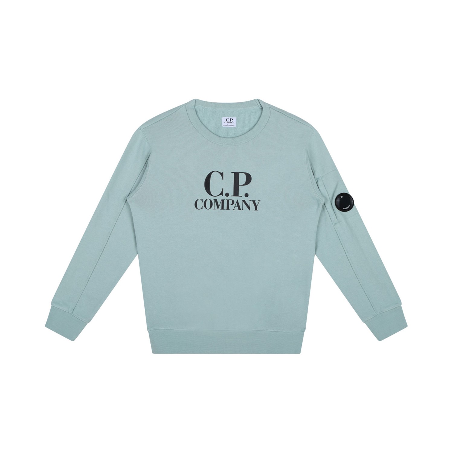 C.P. Company Kids Sage Green Logo Print Sweatshirt. Sage green cotton sweatshirt, logo print to the front, logo patch to the sleeve. Crew neck, long sleeves.