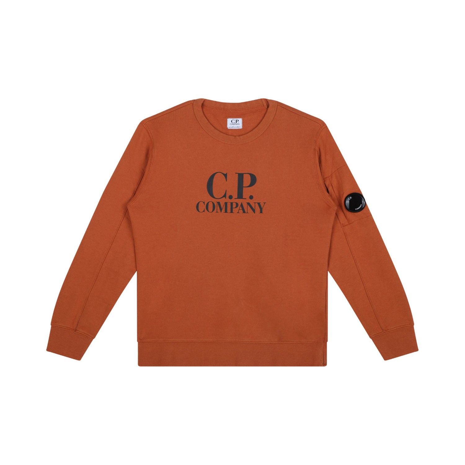 C.P. Company Kids Orange Rust Logo Print Sweatshirt. Orange rust cotton sweatshirt, logo print to the front, logo patch to the sleeve. Crew neck, long sleeves.