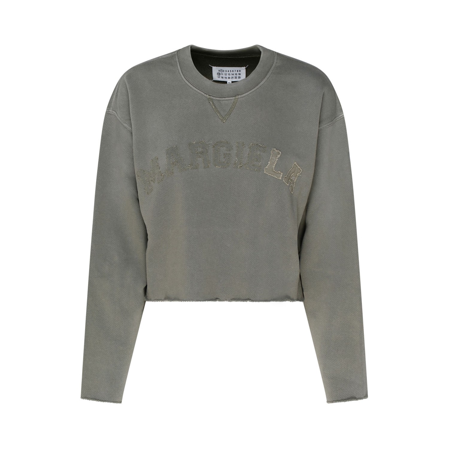 Maison Margiela Olive Green Cotton Logo Patch Cropped Sweatshirt. Olive green cotton cropped sweatshirt, faded effect, logo patch to the front, signature four stitch logo, drop shoulder, long sleeves.