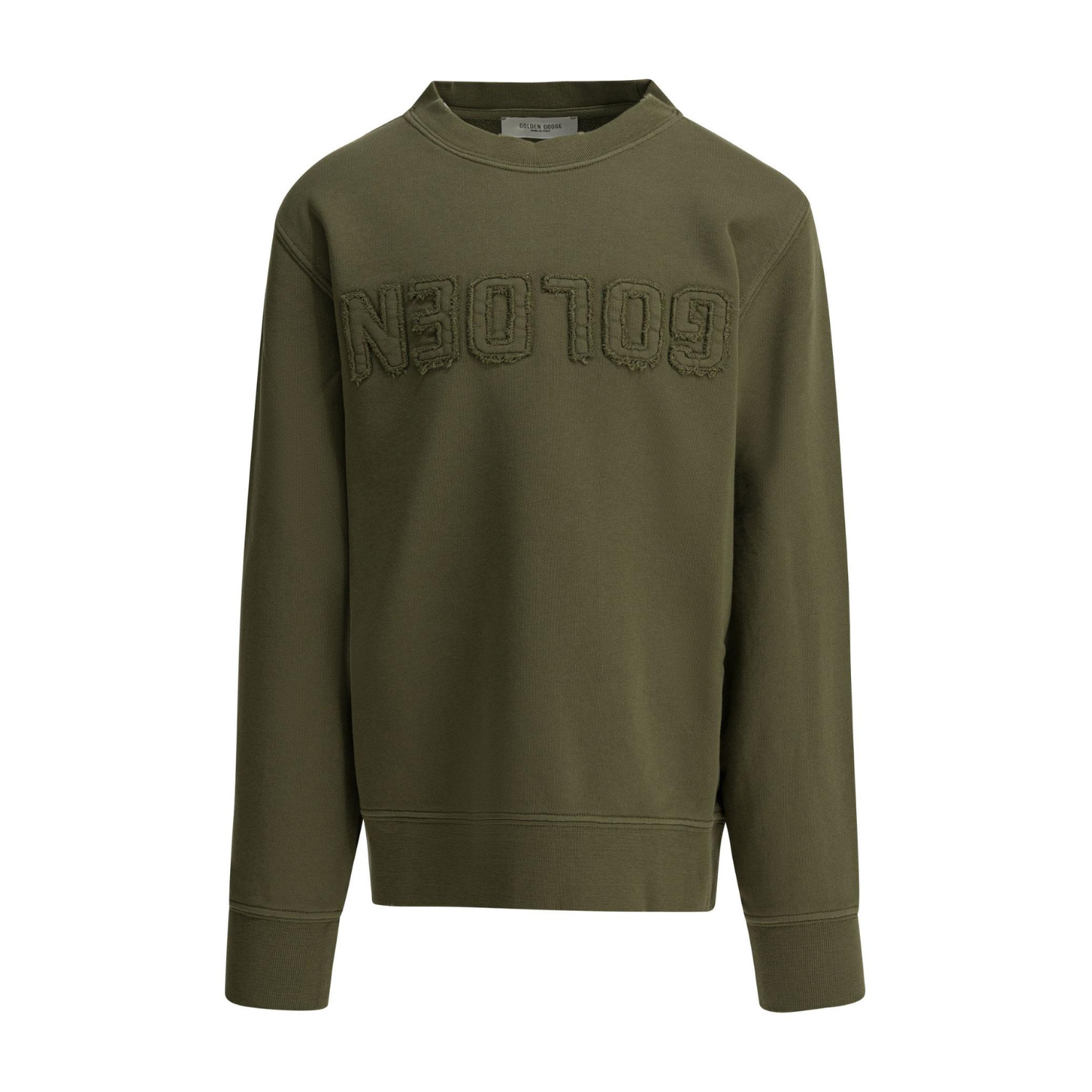 Goldne Goose Dusty Olive Sweatshirt With Embossed Logo. Dusty olive cotton sweatshirt with embossed logo to the front, crew neck and long sleeves.